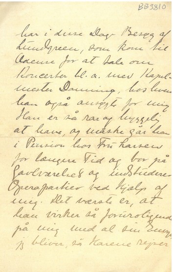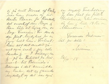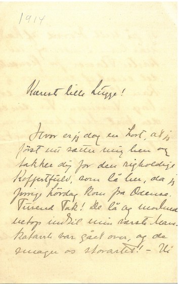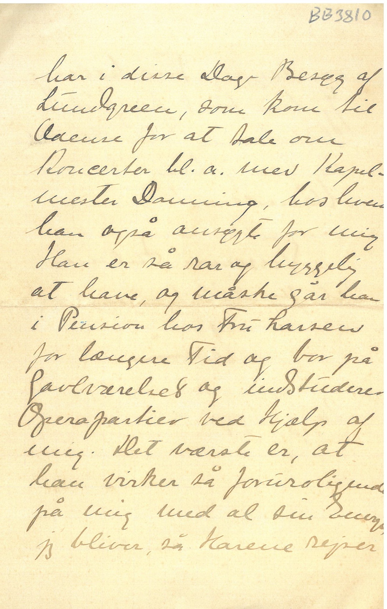 Hvor er jeg dog en Lort, at jeg først nu sætter mig hen og takker dig for den righoldige Koffertfuld, som lå her, da jeg forrige Lørdag kom fra Odense. Tusend Tak! De lå og modnede netop indtil min værste Mavekatarrte var gået over, og de smagte os storartet! - Vi har i disse Dage Besøg af Lundgreen, som kom til Odense for at tale om Koncerter bl.a. med Kapelmester Danning, hos hvem han også ansøgte for mig. Han er så rar og hyggelig at have, og måske går han i Pension hos Fru Lassen for længere Tid og bor på Gavlværelset og indstuderer Operapartier ved Hjælp af mig. Det værste er, at han virker så foruroligende på mig med al sin Energi, jeg bliver så Hårene rejser sig på mit Hoved af Rædsel, når han sidder og udkaster Planer for Koncerter, det eneste af den Slags, jeg kan tåle at lagre om, er Norge-Tournéen! For den er der først Mulighed for en Gang helt hen i Foråret! Men alt det andet går vist også nok i sig selv, tænker jeg. - I Fredags var jeg på en Fribillet fra Houmark - til Première i Odense i det smukke ny Teater, det er ganske nydeligt, og det var ogsaa en nydelig Forestilling. Jeg har fået én fuldt betalende Elev derude, så har jeg hele 18 Kr om Måneden!
