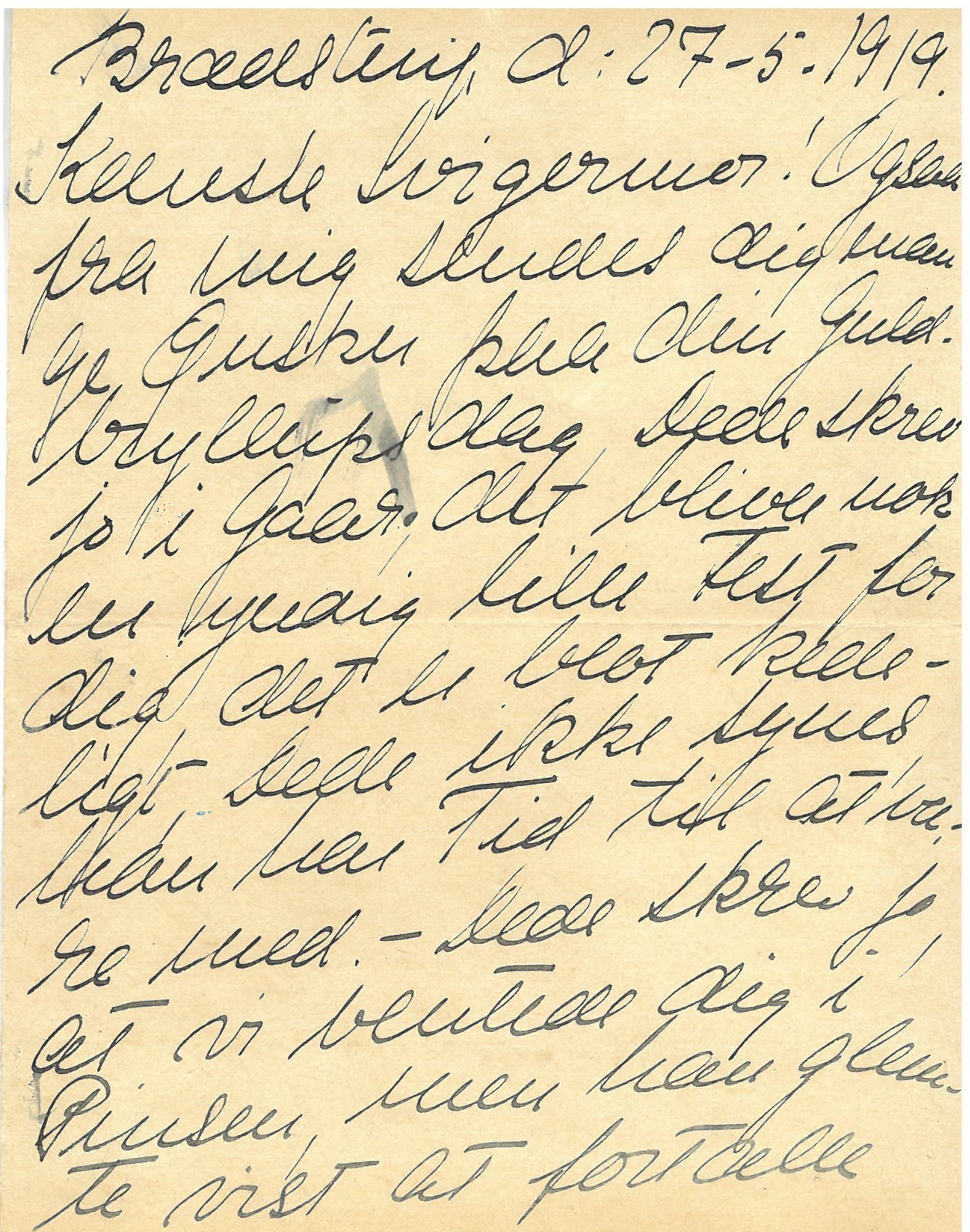 Kæreste Svigermor! Ogsaa fra mig sendes dig mange Ønsker paa din Guldbryllupsdag, Dede skrev jo i Gaar; det bliver nok en yndig lille Fest for dig, det er blot kedeligt Dede ikke synes han har Tid til at være med. - Dede skrev jo, at vi ventede dig i Pinsen, men han glemte vist at fortælle at vi vilde have Drengen i Kirke 2_den_ Pinsedag, saa du maa da endelig komme. - Vi kan nu begynde at se Ende paa vores Byggeri, men det har jo ogsaa varet dobbelt saa længe som vi havde tænkt os, det har været en gyselig Tid at gennemgaa, men yndigt faar vi det, det skal blive morsomt at vise dig det. Vi har i Søndags været til Sølvbryllup paa Rødvigsballe, det var en yndig Fest, 80 Mennesker, spiste i Telt i Haven & dansede længe bagefter. Fin Mad & god Stemning. Dede holdt en pæn Tale, jeg tror, han ender som Taler. Du faar nok godt Vejr, & saa har jeg hørt engang, at Tranekær, - naar Æbletræerne blomstrer, er prægtig smuk. Hils nu alle Bryllupsgæsterne, et Kys til dig selv fra Drengene & din heng. Minna.