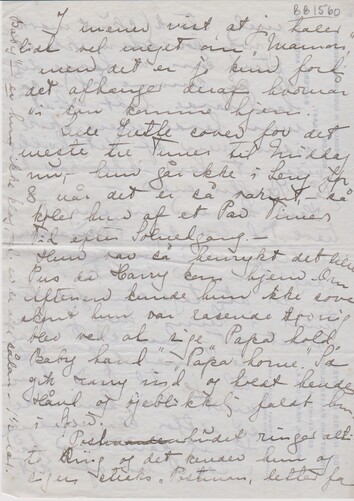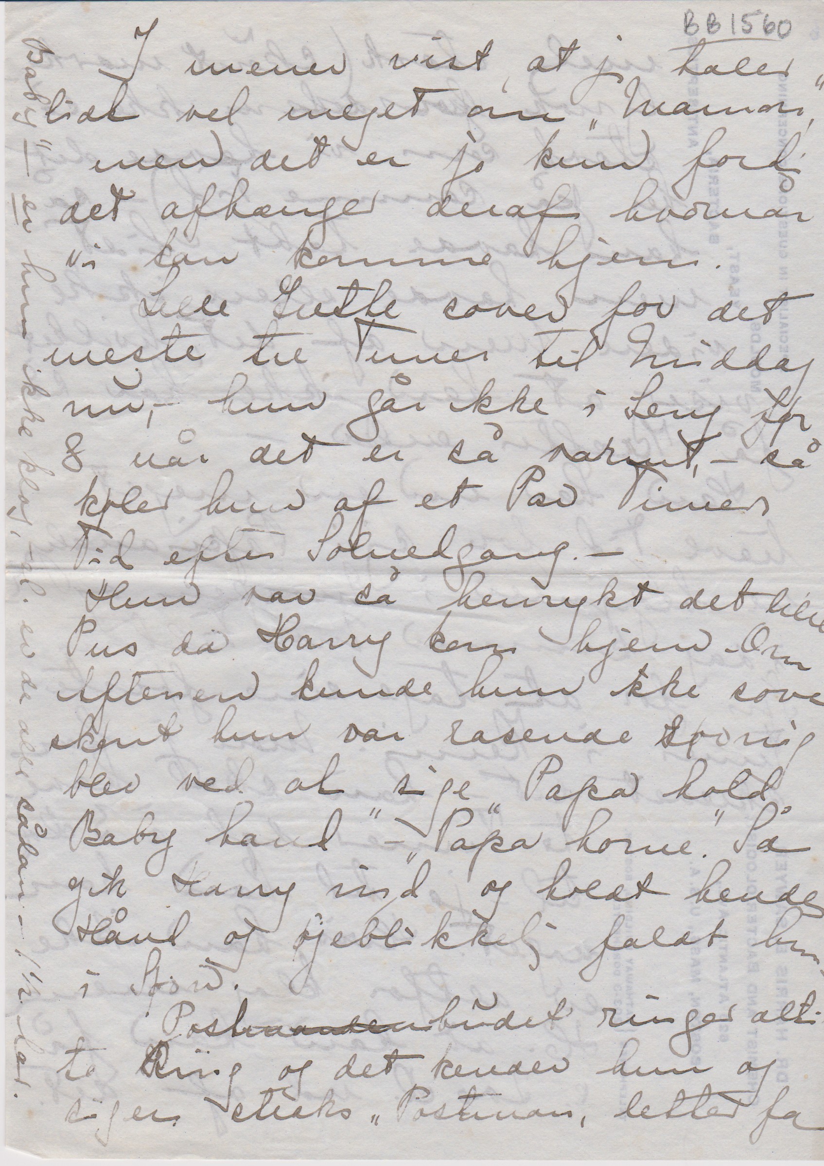 Hun var så henrykt det lille Pus da Harry kom hjem. Om Aftenen kunde hun ikke sove skønt hun var rasende søvnig blev hun ved at sige ”Papa hold Baby Hand” – ”Papa home”. Så gik Harry ind og holdt hendes Hånd og øjeblikkelig faldt hun i Søvn.