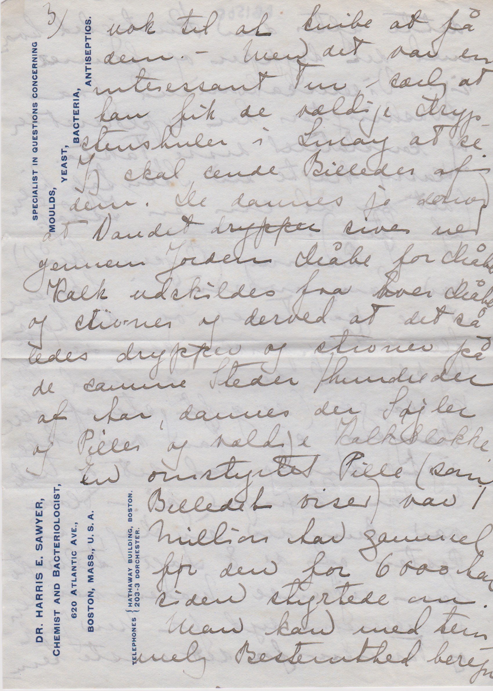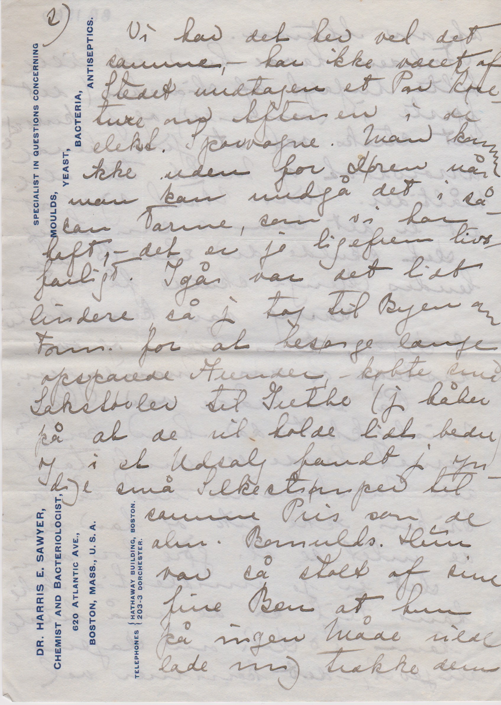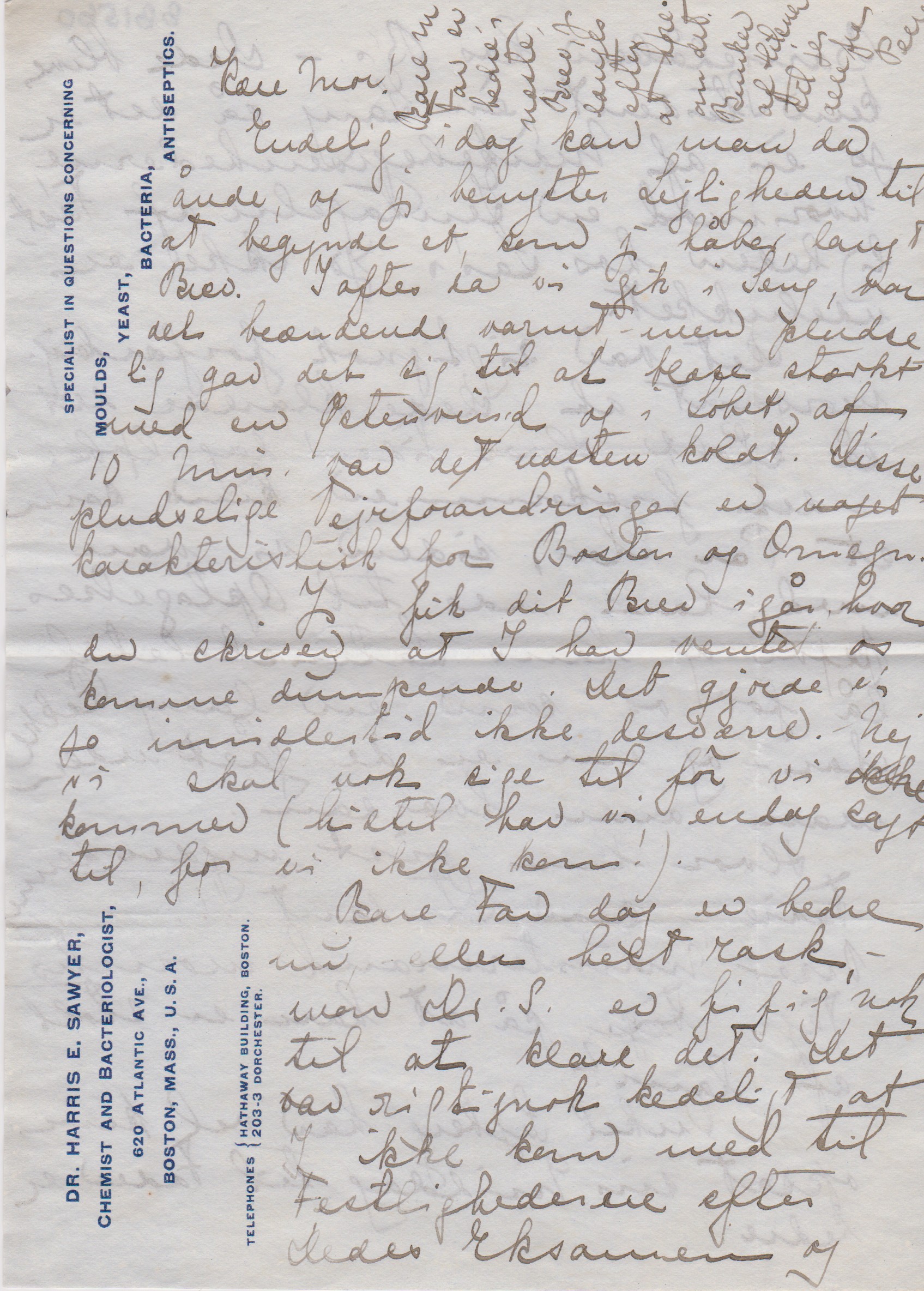 Endelig idag kan man da ånde, og jeg benytter Lejligheden til at begynde et, som jeg håber, langt Brev. Iaftes da vi gik i Seng, var det brændende varmt - men pludselig gav det sig til at blæse stærkt med en Østenvind og i Løbet af 10 Min. var det næsten koldt. Disse pludselige Vejrforandringer er noget [”noget” overstreget] karakteristisk for Boston og Omegn.
