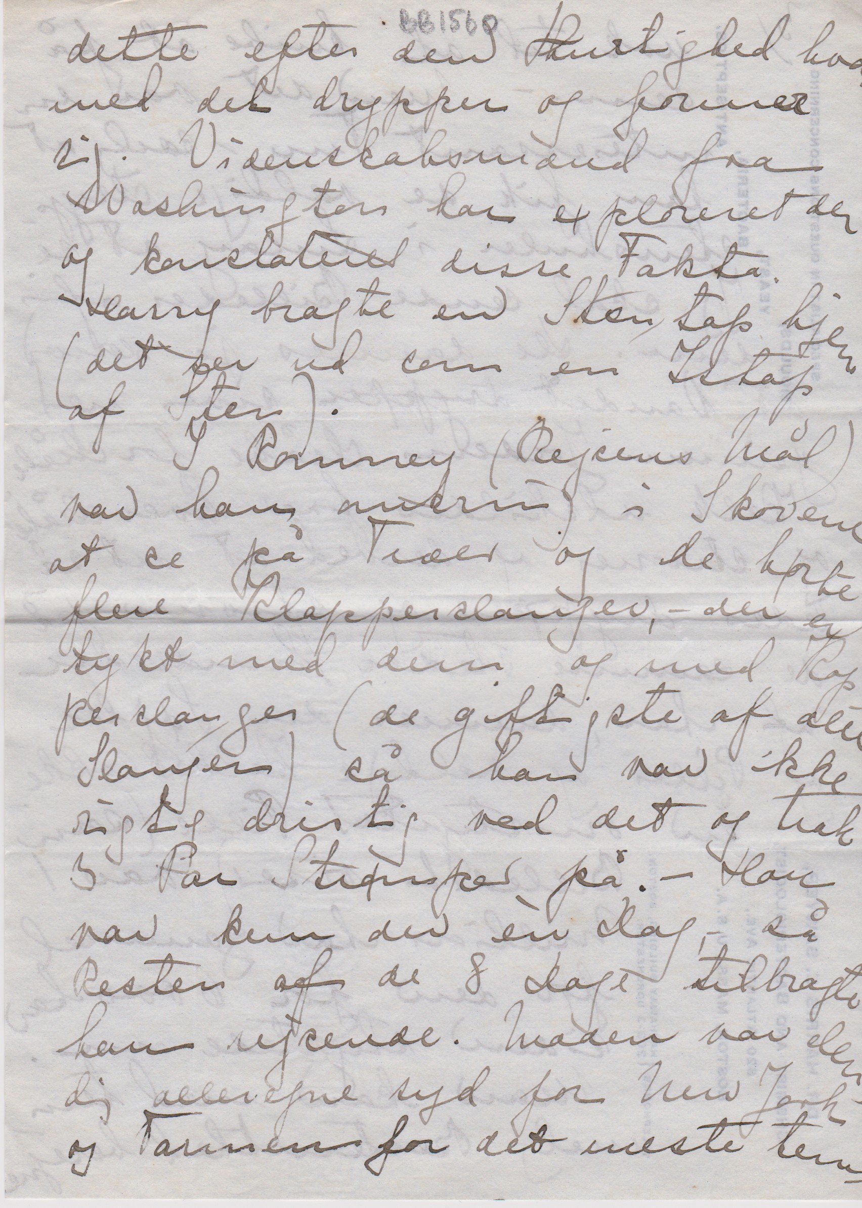 I Romney (Rejsens Mål) var han omkring i Skovene at se på Træer og de hørte flere Klapperslanger, - der er tykt med dem og med Kopperslanger (de giftigste af alle Slanger) så han var ikke rigtig dristig ved det og trak 3 Par Strømper på. – Han var kun der èn Dag, - så Resten af de 8 Dage tilbragte han rejsende. Maden var elendig alle vegne syd for New York – og Varmen for det meste tem-