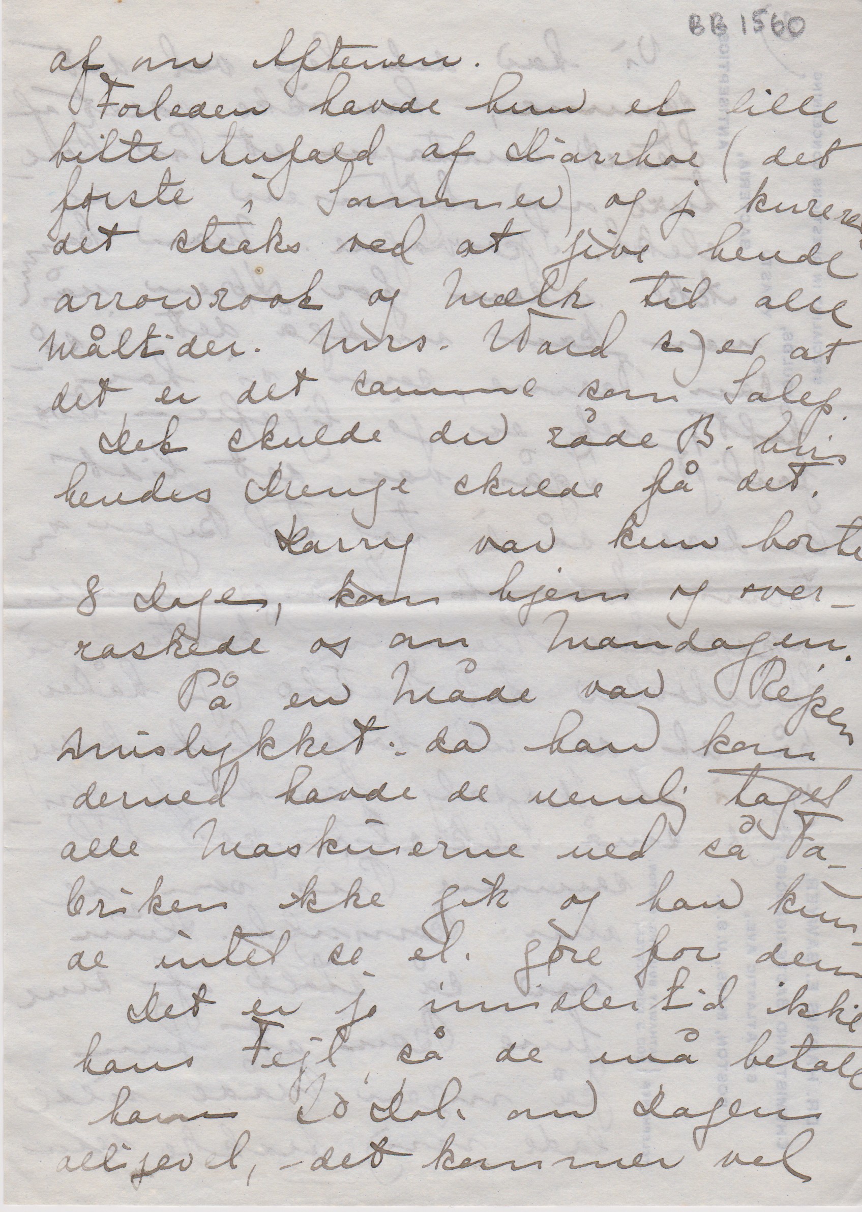 Forleden havde hun et lille bitte Anfald af Diarrhe (det første i Sommer) og jeg kurerede det straks ved at give hende arrowroot og Mælk til alle Måltider. Mrs. Ward siger at det er det samme som Salep. Det skulde du råde B. hvis hendes Drenge skulde få det.