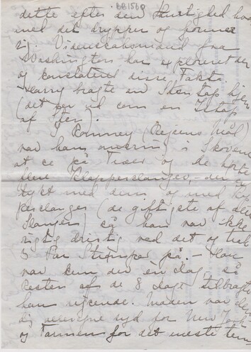 nok til at knibe med at få dem. – Men det var en interessant Tur – særlig at han fik de vældige Drypstenshuler i Luray at se. Jeg skal sende Billeder af dem. De dannes jo derved, at Vandet drypper ["Drypper" overstreget] siver ned gennem Jorden Dråbe for Dråbe. Kalk udskildes fra hver Dråbe og stivner og derved at det så ledes drypper og stivner på de samme Steder Hundreder af Aar, dannes der Søjler og Piller og vældige Kalkblokke. En omstyrtet Pille (som Billedet viser) var 1 Million Aar gammel før den for 6000 Aar siden styrtede om. Man kan med temmelig Bestemthed beregne dette efter den Hurtighed hvormed det drypper og former sig. Videnskabsmænd fra Washington har exploret der og konstateret disse Fakta. Harry bragte en Stentap hjem (det ser ud som en Istap af Sten).