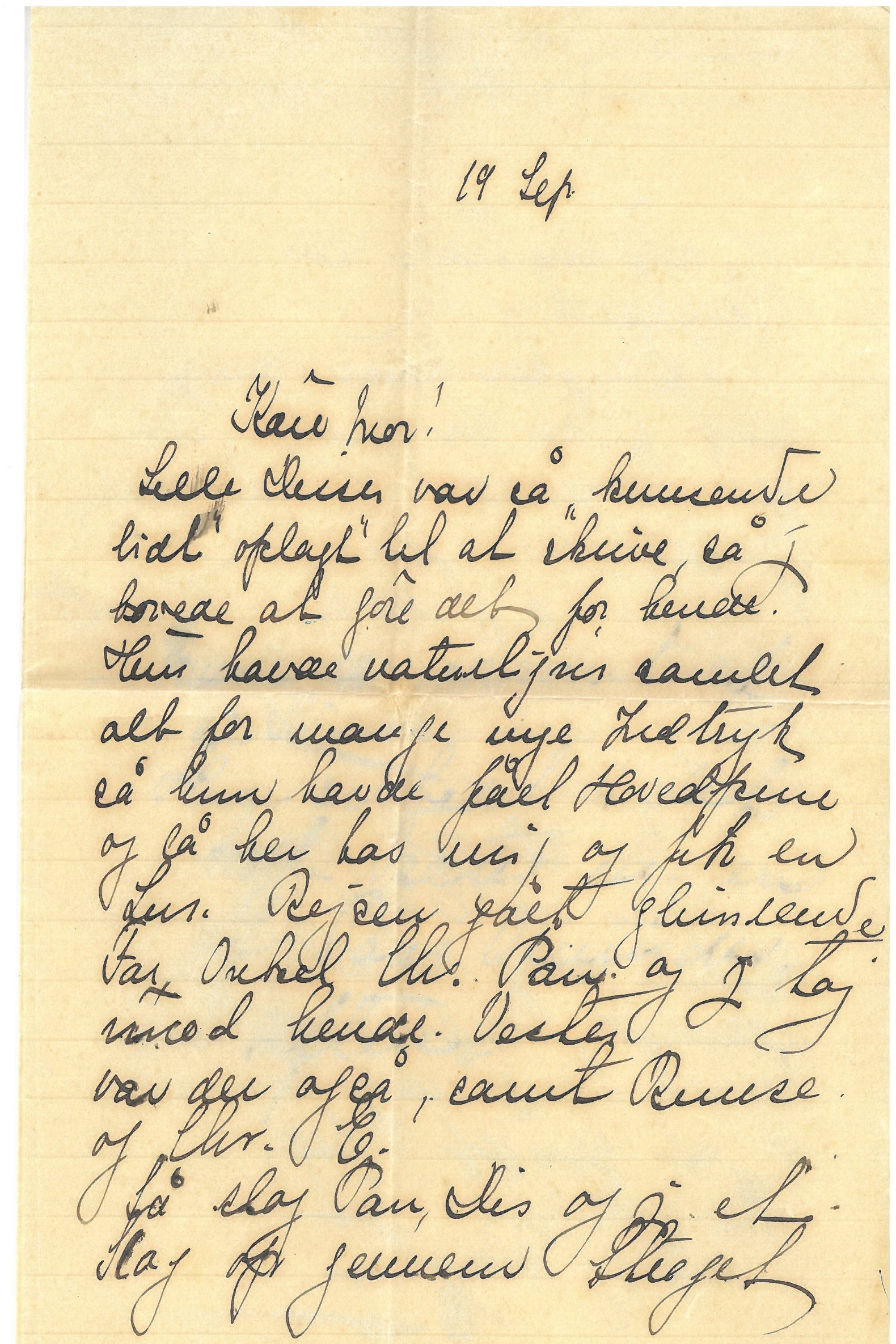 Øverst s. 1 er skrevet: "19 Sep." Årstallet er muligvis 1896 eller 1897. Ellen Sawyer arbejdede i dette tidsrum på sin mosters pensionat i København, og veninden, Julie/Pan Brandt, som Ellen og Astrid/Dis Warberg mødes med, var også flyttet til hovedstaden.