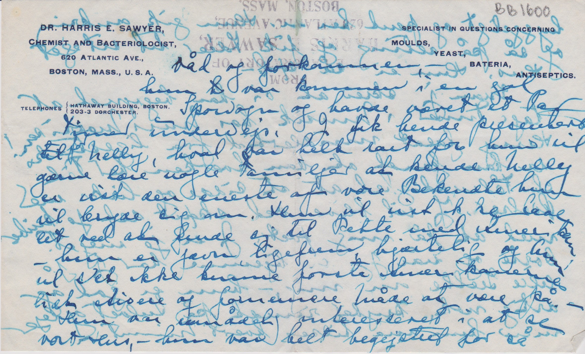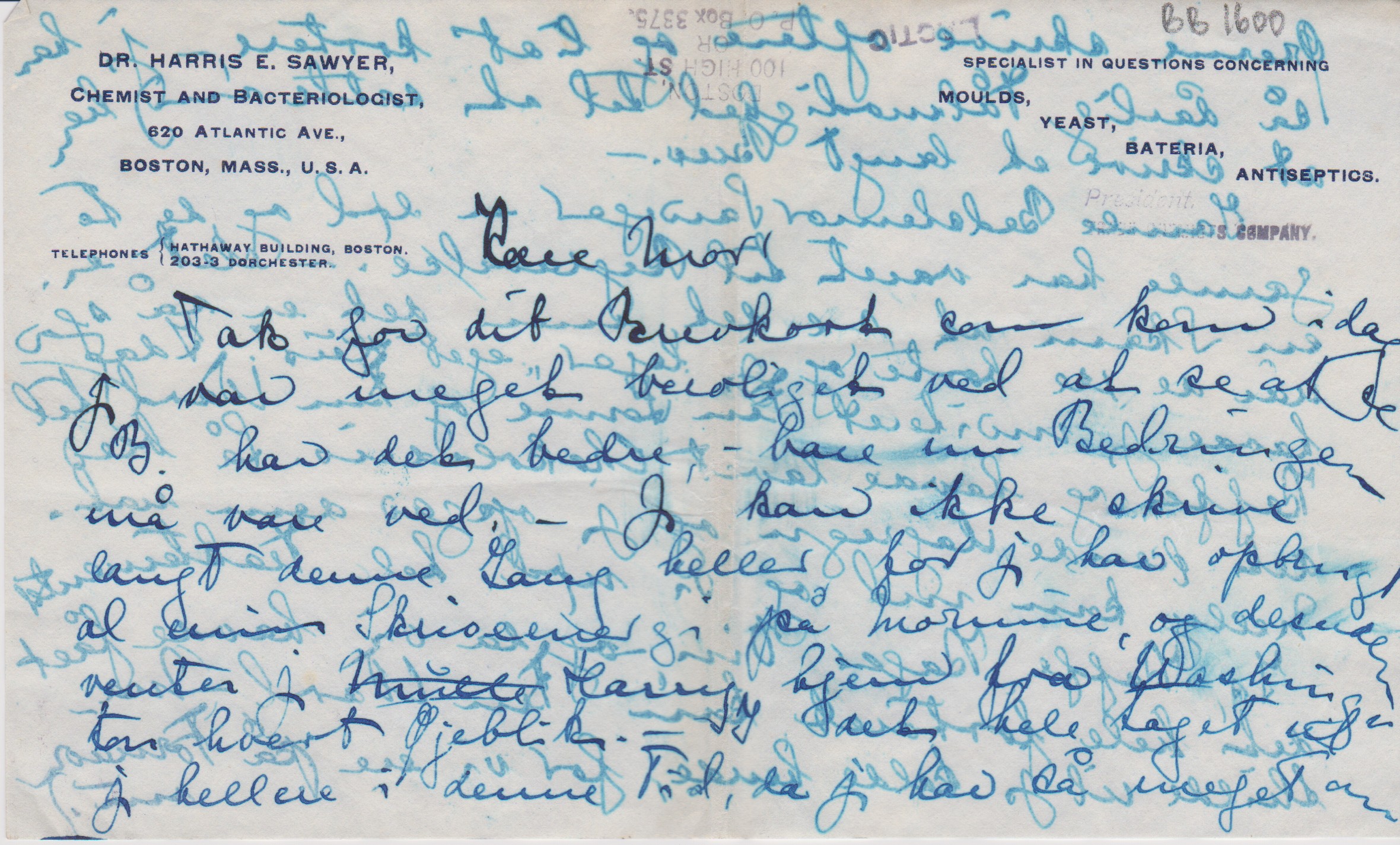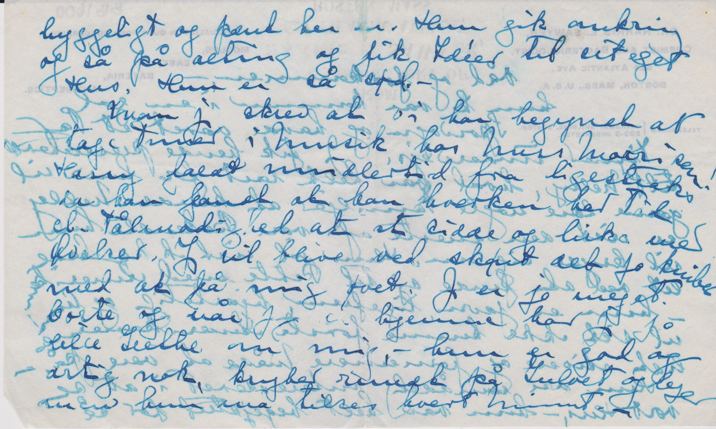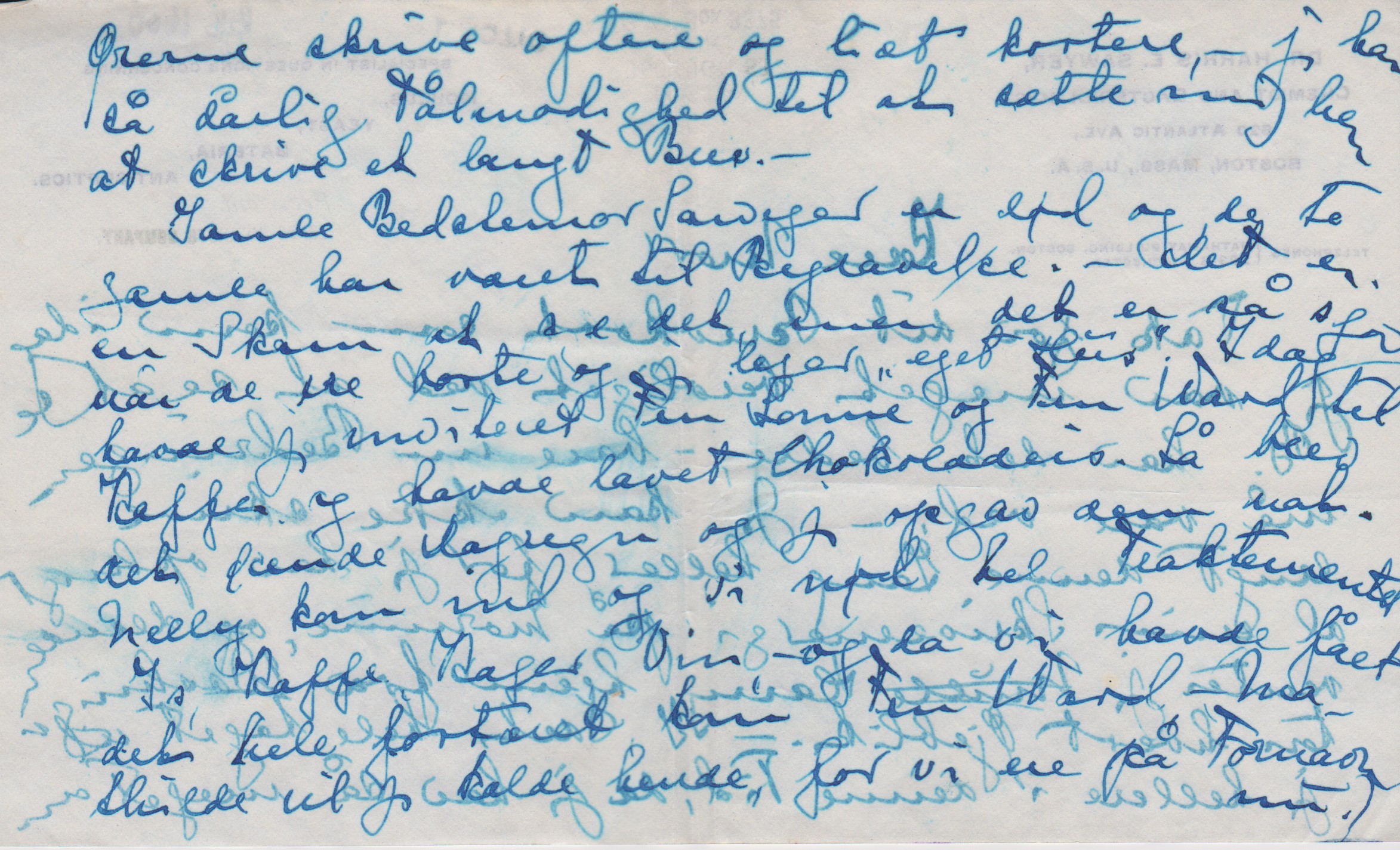 Tak for dit Brevkort som kom idag. Jeg var meget beroliget ved at se at se B. har det bedre, - bare nu Bedringen må vare ved. – Jeg kan ikke skrive langt denne Gang heller for jeg har opbrugt al min Skriveenergi på Mornine, og denne venter jeg Mulle["Mulle" overstreget] Harry hjem fra Washington hvert Øjeblik. – I det hele taget vil jeg hellere i denne Tid, da jeg har så meget om Ørerne skrive oftere og lidt kortere. – jeg har så dårlig Tålmodighed til at sætte mig hen at skrive et langt Brev. –