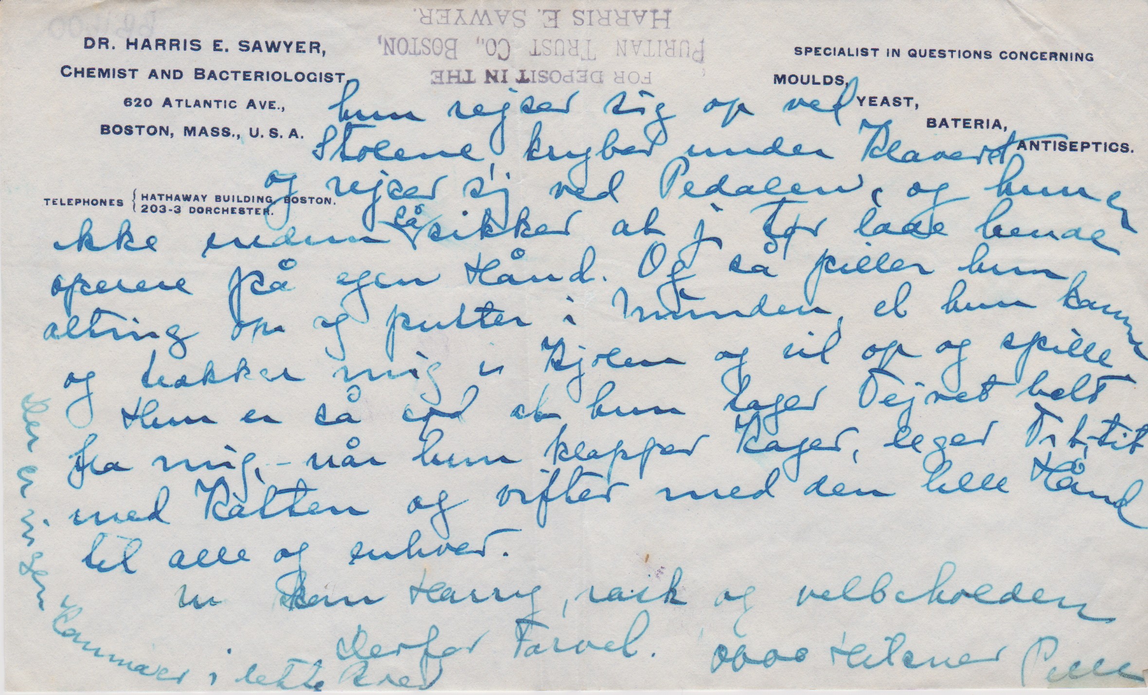 Ellen Sawyers datter, Grethe, gift Jungstedt, blev født 16. jan. 1900. Brevet må være skrevet dette år, idet Grethe kravler og kan rejse sig op ved møblerne.
