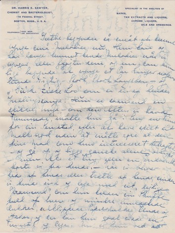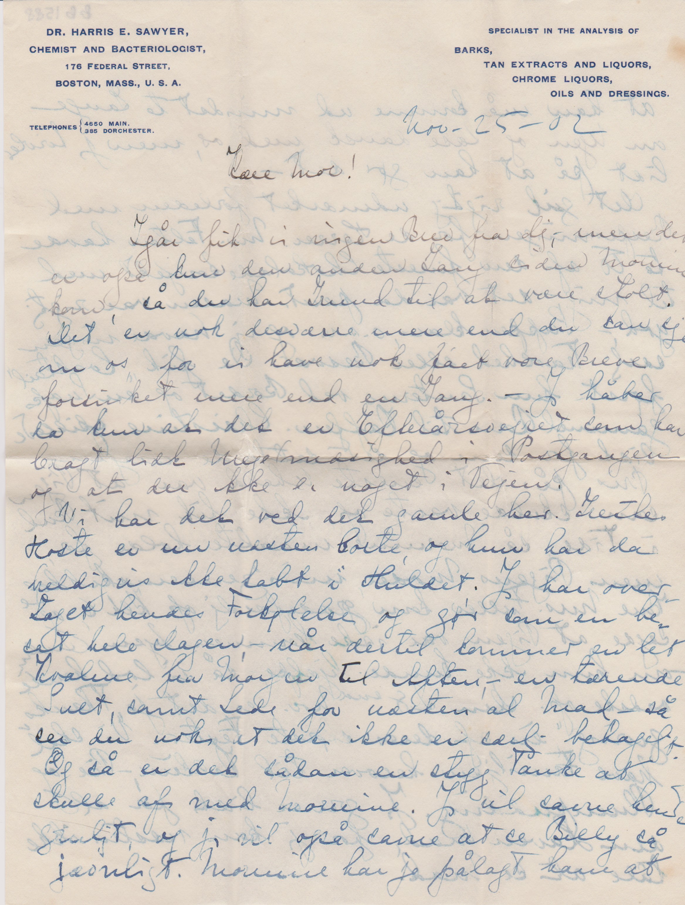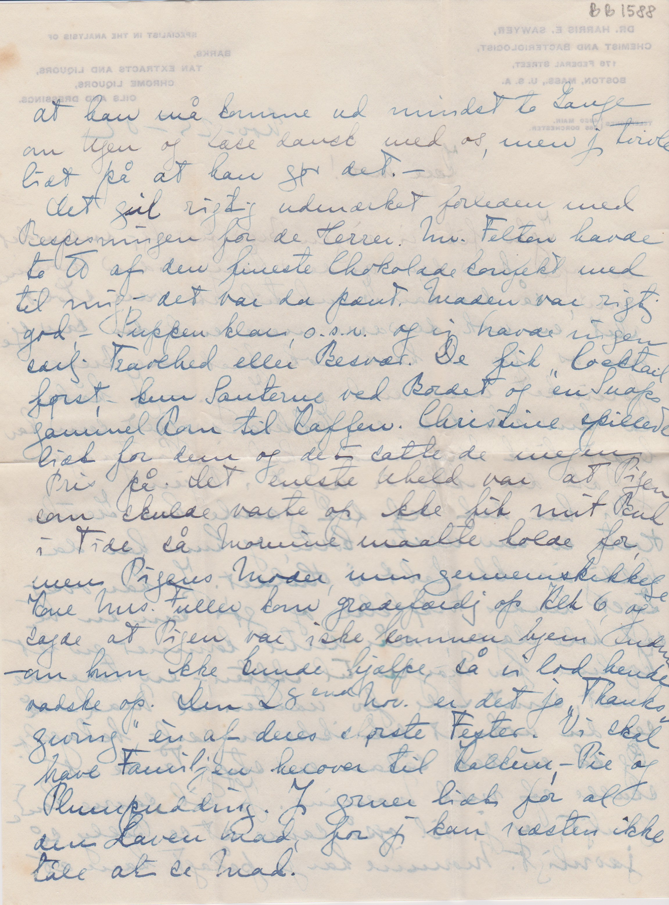 Det gik rigtig udmærket forleden med Bespisningen for de Herrer. Mr. Felton havde to Pund [tegn for pund] af den fineste Chokoladekonfekt med til mig, - det var da pænt. Maden var rigtig god, - Suppen klar, o. s. v. vi havde ingen særlig Travlhed eller Besvær. De fik ”Cocktail” først, - kun Sauterne ved Bordet og en Snaps gammel Rom til Kaffen. Christine spillede lidt for dem og det satte de megen Pris på. Det eneste Uheld var at Pigen som skulde varte op, ikke fik mit Bud i Tide, så Mornine maatte holde for, men Pigens Moder, min gennemskikkelige Kone Mrs. Fuller, kom grædefærdig op Kl. 6 og sagde, at Pigen var ikke kommen hjem endnu – om hun ikke kunde hjælpe, så vi lod hende vadske op. Den 28ende Nov. er det jo ”Thanksgiving”, èn af deres største Fester. Vi skal have Familjen herover til Kalkun, - Pie og Plumpudding. Jeg gruer lidt for al den Laven Mad, for jeg kan næsten ikke tåle at se Mad.