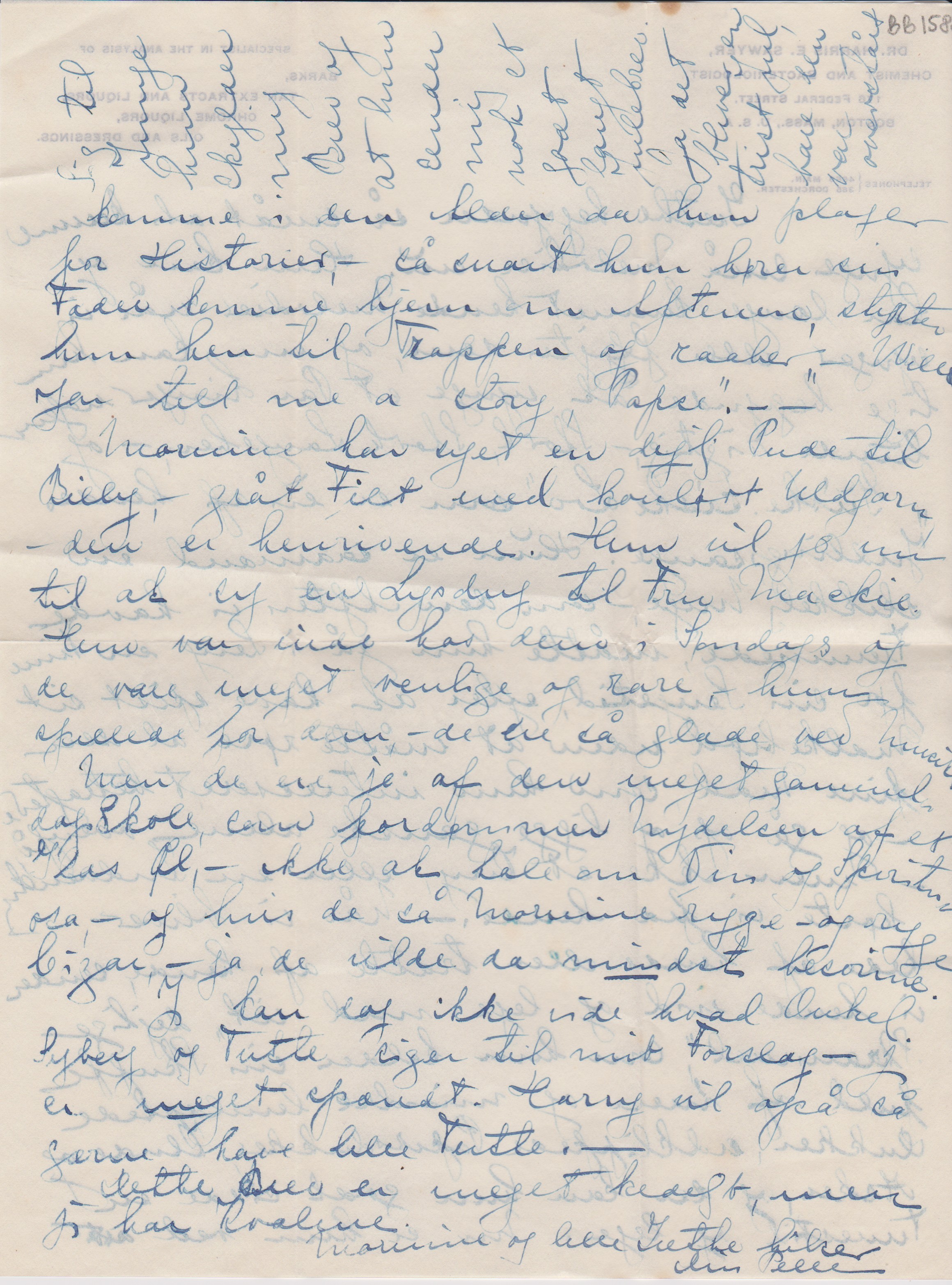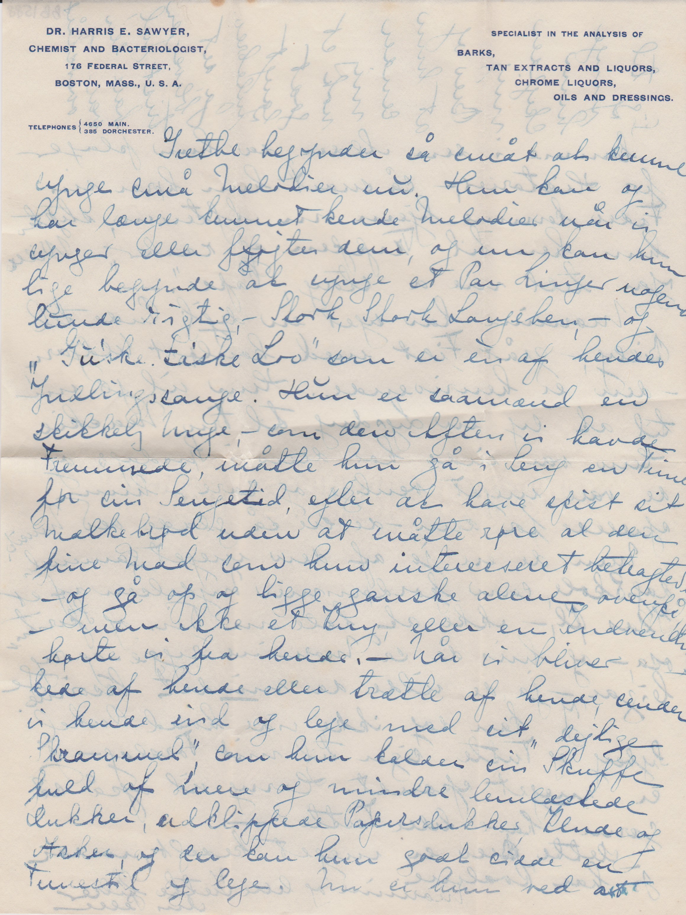 Grethe begynder så småt at kunne spille små Melodier nu. Hun kan og har længe kunnet kende Melodier når vi synger eller fløjter dem, og nu kan hun lige begynde at synge et Par Linjer nogenlunde rigtig, - Stork, Stork Langeben, - ”Gusk. ta'ske Lov” som er èn af hendes Yndlingssange. Hun er saamænd en skikkelig Unge, - som den Aften vi havde Fremmede, måtte hun gå i Seng en Time før sin Sengetid, efter hun havde spist sit Mælkebrød uden at måtte røre al den fine Mad, som hun interesseret betragtede – og gå op og ligge ganske alene ovenpå - men ikke et Kny - eller en Indvending hørte vi fra hende. - Når vi bliver kede af hende eller trætte af hende, sender vi hende ind og lege med sit ”dejlige Skrammel”, som hun kalder som hun kalder en Skuffe af store og mindre lemlæstede Dukker, udklippede Papirsdukker, Klude og Æsker, og der kan hun godt sidde en Timestid og lege. Nu er hun ved at komme i den Alder, da hun plager for Historier, - så snart hun hører sin Fader komme hjem om Aftenen, styrter hun hen til Trappen og raaber” – Will you tell me a Story, Papse”. - -