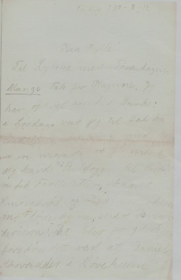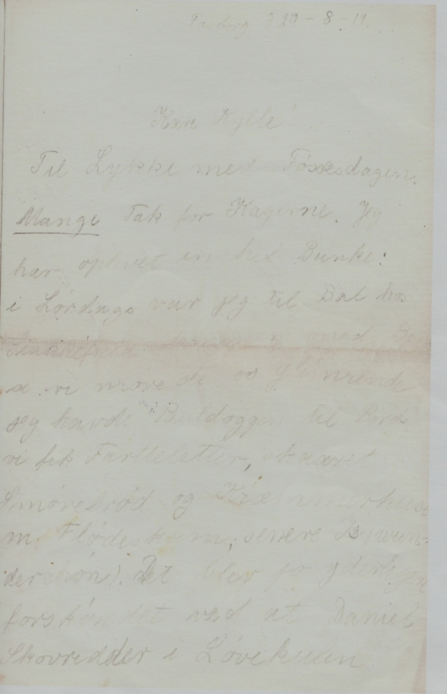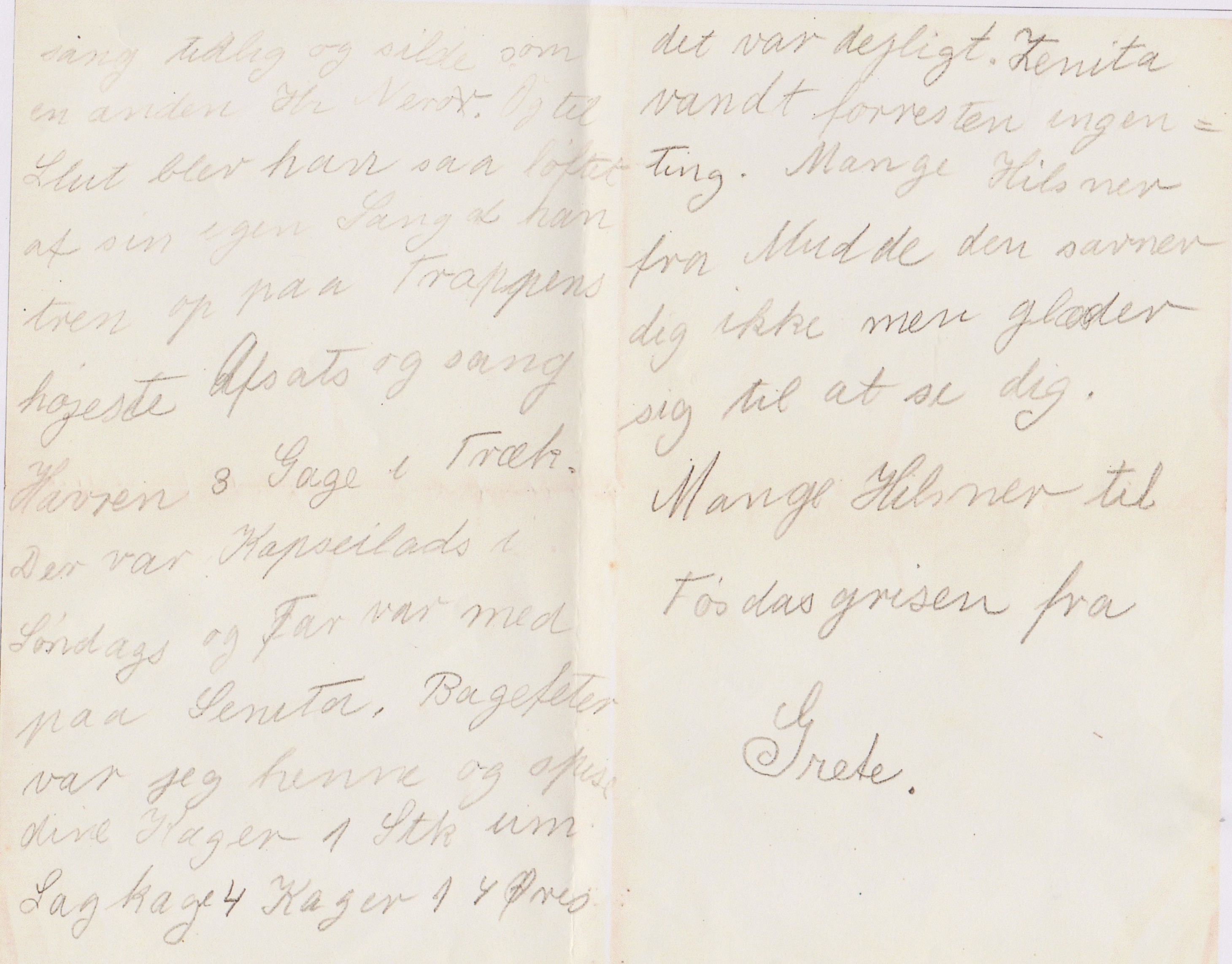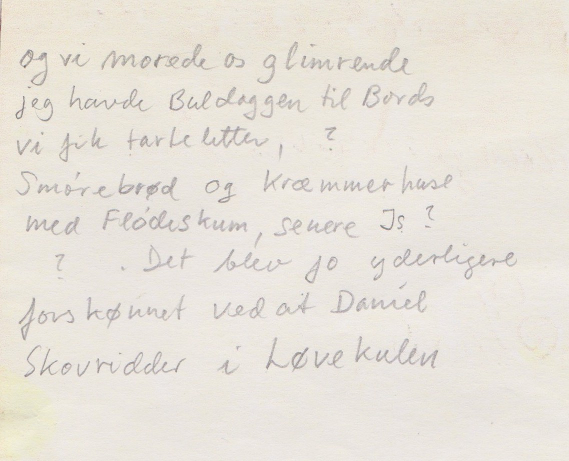 Til Lykke med Føssesdagen. Mange Tak for Kagerne. Jeg har oplevet en hel Bunke: i Lørdags var jeg til Bal hos [ulæseligt] vi morede os glimrende jeg havde Buldoggen til Bords vi fik Tarteletter, skaaret Smørrebrød og Kræmmerhuse med Flødeskum, senere Is[ulæseligt]. Det blev yderligere forskønnet ved at Daniel Skovridder i Løvekulen sang tidlig og sen som en anden Hr. Neror [det sidste "r" i ordet overstreget]. Og til Slut blev han saa løftet af sin egen Sang at han tren op paa Trappens højeste Afsats og sang Havren 3 Gange i Træk. Det var Kapseilads i Søndags og Far var med paa Senetor. Bagefter var jeg henne og spise dine Kager 1 Stk um. Lagkage 4 Kager 1 4 Øres det var dejligt. Zenita vandt forresten ingenting. Mange Hilsner fra Mudde den savner dig ikke men glæder sig til at se dig.