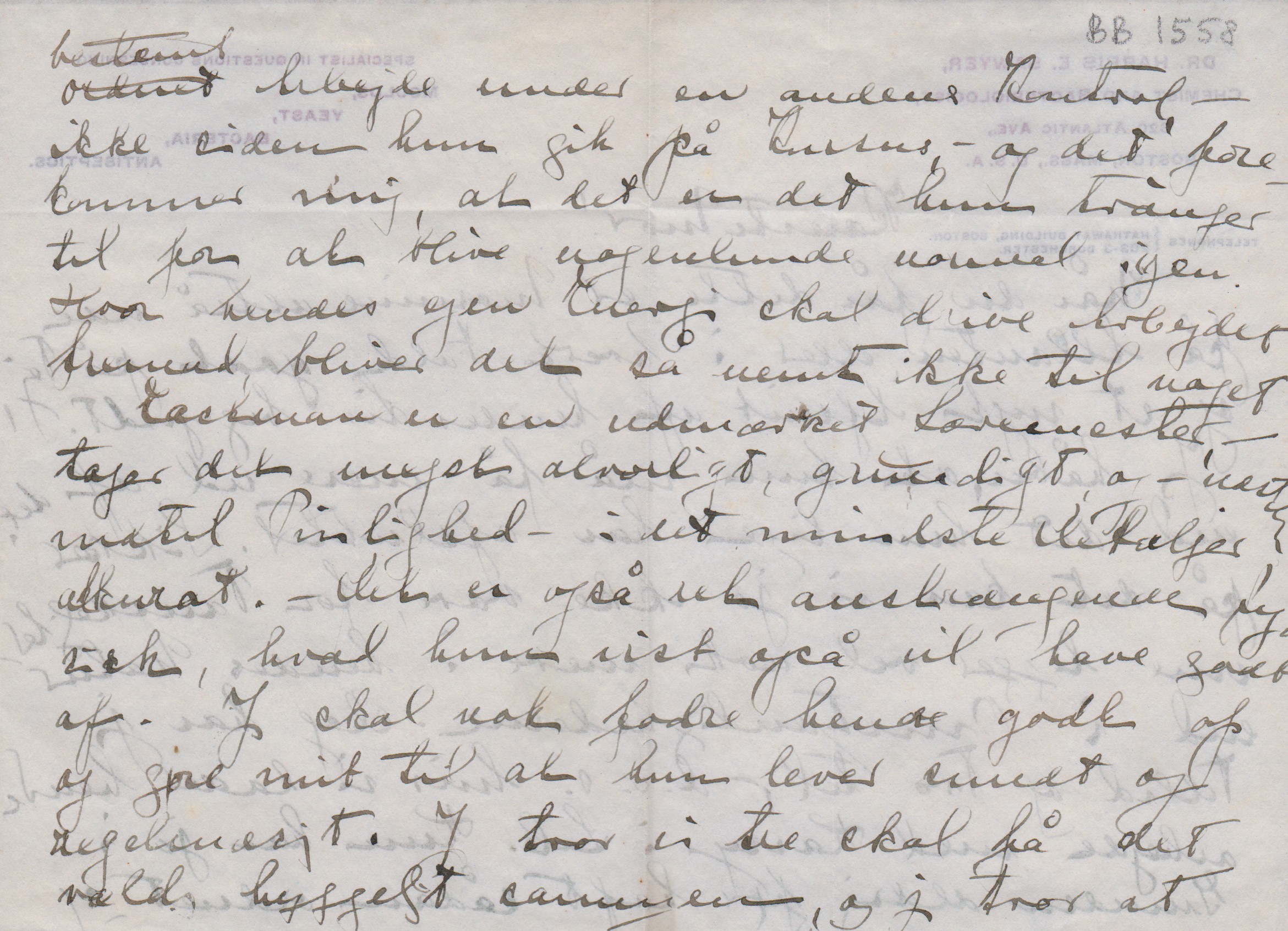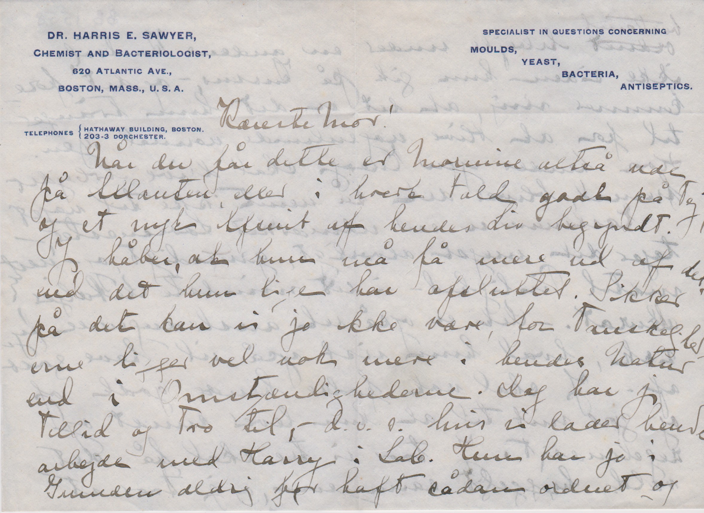 Når du får dette er Mornine altså ude på Atlanten, eller i hvert Fald godt på Vej, og et nyt Afsnit af hendes Liv begyndt. Jeg håber, at hun må få mere ud af det, end det hun lige har afsluttet. Sikker på det kan vi jo ikke være, for Vanskelighederne ligger vel nok mere i hendes Natur end i Omstændighederne. Dog har jeg Tillid og Tro til, - d.v.s. hvis vi lader hende arbejde med Harry i Lab. Hun har jo i Grunden aldrig før haft sådan ordnet og ordnet bestemt [”ordnet” overstreget; ”bestemt” indsat over linjen] Arbejde under en andens Kontrol, – ikke siden hun gik på Kursus, - og det forekommer mig, at det er det hun trænger til for at blive nogenlunde normal igen. Hvor hendes egen Energi skal drive Arbejdet fremad, bliver det så nemt ikke til noget.