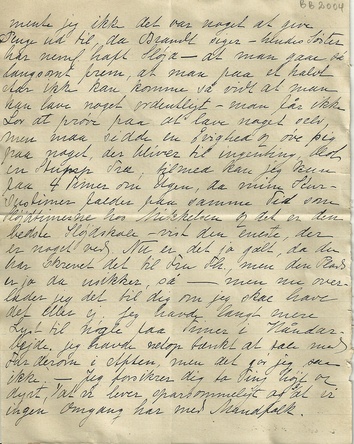 Jeg har glemt at fortælle, at Lut ogsaa kommer i Aften, [over linien skrevet ”i Aften”] men om Frk. Opperm. som Alhed be’r i Dag kommer ved jeg ikke; hendes gamle Tante skal begraves i Morgen, saa hun kommer vist ikke. Det kniber med Pladsen, når vi – som sidst – har 4 fremmede, Dagligstuen er propfuld, men når man tager det lidt med Ro under Spiseakten, saa naas det jo alligevel. - - - Der går meget mere til i Kbhn. af Penge end man aner; som Eks kan jeg anføre: Chr. fik sin Paraply knækket paa Skovturen, min er har ["er" overstreget; over linien skrevet ”har”] til min store Sorg faaet et Knæk jeg begriber ikke hvordan, det må være sket paa Kursusset [det tedje "s" i ordet overstreget], der er så knap Plads til Tøjet; vor Keddel er gaaet itu, den rinder, vor Lampe kan ikke skrues, Kul eller Smaabrænde til at gøre Ild ved; vor Kakkelovn er snavset og skal renses mener Md. Carlsen, Frimærker, Svovlstikker Petroleum, Chr. skulde have et Spejl at synge ved havde hendes Lærerinde paabudt 50 Øre – se alt den Slags tænker man ikke paa, når man er paa Erikshåb og lige kan gaa og tage det; - Sæbe og Soda til Vadsk og Md. Carlsen 1 Kr. for at vadske. Det er ikke fordi, I har sagt vi bruger for mange Penge, at jeg skriver alt dette, men fordi, du ikke maa tro, andet end at der gaar mere til end lige Husholdningspengene. Jeg selv er saa bestyrtet over saa mange uforudsete Udgifter. Skulde vi drikke sød Mælk hver Dag var det 42 Ør. for hver Litter!!! Saa det vilde jo være vanvittigt. Vi skal nok købe Æg paa Torvet når disse slipper op. Vi vilde saa umaadelig gerne have lidt smaa Te sendende; vores er lige ved at slippe op og vi gruer for at købe The allerede. Ost vil vi gerne have, men ikke salt Kød, vi har jo hele det Lammelår endnu. – Alheds og min Gymnastik er 2 Timer om Ugen på gl. Kongevej fra 7-8 om Morgenen. Fru R. korser sig over alt det, vi har for, mener vi kan ikke tåle det. Tænk! Chr,s Spillelærerinde Frk. Behrend har faaet Aarebetændelse i det ene Ben, og Chr. har nu faaet en anden i Bredgade – en forbistret Vej; men det falder heldigvis sammen med hendes Stenograferen, der jo også er et Sted ved Bredgade. – Hør Mor! Vi aner jo ikke, hvor den Fabrik er paa Christianshavn og har ikke Tid til at gå en Dagligdag og få den sporet op og en Søndag er der jo lukket. Maa vi ikke tage den et andet Sted? S.u. Paa Lørdag skal saa Far og jeg til Hvilan. Bed Elle om at sende, det om ”Kvinderne” som [ulæseligt] sendte os, enten ["enten" overstreget] til Hvilan, Iffe bad mig om den, jeg havde et ”Velkommenbrev” fra dem i Gaar. Hun kan jo skrive til Iffe med det samme. Det skal helst være straks. – Undskyld nu, hvis dette Brev er lidt jaget skreven, men jeg har jo travlt, da vi jo skal ha Fremmede, og jeg skal lære Lektier – Øvningen har jeg opgivet for i Dag – og jeg jo skal have de Kasser besørgede. – Jeg har komplet Skrivekrampe, det er gået i en sådan Fart.