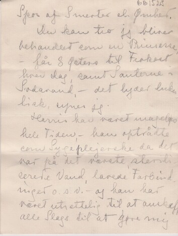 Harris har været mageløs hele Tiden, - han optrådte som Sygeplejerske da det var på det værste, steriliserede Vand, lavede Forbindinger o.s.v. – og han har været utrættelig til at skaffe mig alle Slags til at gøre mig Livet behageligt.