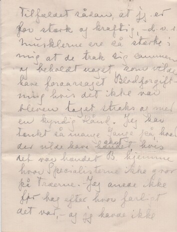 Nu, da alt er velståeoverstået ["stå" i ordet overstreget], kan det vel interessere dig at høre nærmere om mit ”Tilfælde”. Jeg havde det storartet og Dr. var meget tilfreds med mig, da jeg ["jeg" indsat over linjen] pludselig Onsd. Eft. Klk 5 følte en Kuldegysning og det befandtes, at jeg havde høj Feber. Der blev straks telefoneret efter Dr. Jenkins og han masede med mig til Midnat. Ligeledes næste Dag men Feberen steg, og han blev mere og mere betænkelig og om Eft. sendte han Bud efter en Specialist Dr. Cushion, som øjeblikkelig kom og undersøgte mig og konfererede med Dr. Jenkins. Jeg anede ikke hvad de aftalte, så du kan tænke dig min Forbavselse, da den næste Morgen Døren går op og ind strømmer de to Dr. og tre Sygeplejersker med alle Slags mærkelige Apparater. Derpå blev jeg bedøvet (hvilket var meget behageligt) og Dr Cushion fjernede Skaden. Han forklarede Tilfældet sådan, at jeg er for stærk og kraftig, - d.v.s. Musklerne ere så stærke i mig at de trak sig sammen og beholdt noget, som vilde have foraarsaget Blodforgiftning hvis det ikke var bleven taget straks og med en kyndig Hånd. Jeg har tænkt så mange Gange på, hvad der vilde være sket ["hændt" overstreget; "sket" indsat over linjen] hændt, hvis det var hændet B. hjemme, hvor Specialisterne ikke gror på Træerne. – Jeg anede ikke før bag efter, hvor farligt det var – og jeg havde ikke Spor af Smerter eller Ømhed.