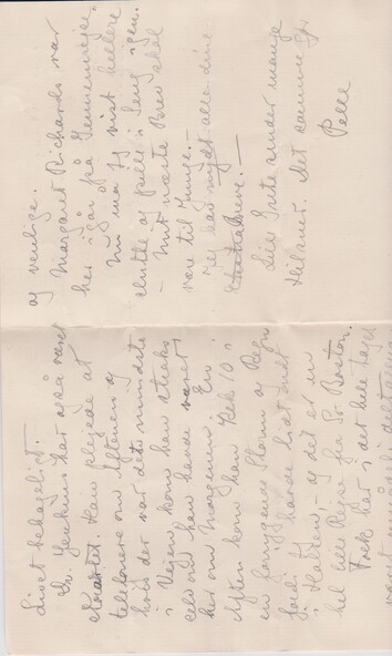Jeg var meget ked af at Harry kom for sent på det med at skrive i Tirsdags, da du formodentlig har været lidt urolig efter min dårlige Opførsel for 14 Dage siden. Der er imidlertid ingen Grund til Ængstelse nu, - jeg sidder op i en Lænestol hver Dag, spiser menneskelig Føde og befinder mig udmærket. Dr. Cushions Sygeplejerske er taget bort idag og Mrs Loud er kommen tilbage for at passe mig og den Lille indtil jeg får lidt flere Kræfter og kan passe hende selv. Hun er et ualm. godt Barn, - sover og spiser og passer sine andre Forretninger til Fuldkommenhed. Om Dagen bliver hun fodret hver anden Time, om Natten passer hun selv sine Spisetimer, sover 3-4 Timer, vågner og brøler, så hele Huset ryster indtil hun får sin Flaske. Hun måtte jo desværre vænnes fra, da jeg fik Feber. – Hun er utrolig sød at se på og tegner til at blive en køn lille Unge. Øjnene ere meget større nu, end de var, - de ere næsten sorte, med et lille Anstægrøg ["æg" i ordet overstreget; ”røg” indsat over linjen] af blåt. Hun bliver højt beundret af alle og erklæres for at være en ”Personlighed” og at have ”høj Grad af Karakter”. Harry spiller for hende og han kan ”tydelig se at hun er meget musikalsk”. Han er meget stolt af sin Datter og vi ere enige om, at det var en ren Fejltagelse at vi ønskede en Dreng – en Pige er langt at foretrække.
