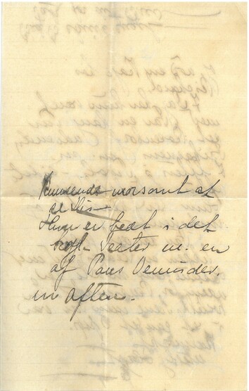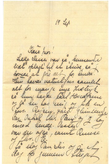 Lille Disser var så “knusende lidt oplagt til at skrive”, så jeg lovede at gøre det for hende. Hun havde naturligvis samlet alt for mange nye Indtryk så hun havde fået Hovedpine og lå her hos mig og fik en Lur. Rejsen gået glimrende, Far, Onkel Chr. Pan og jeg tog imod hende. Vester var der også, samt Rimse og Chr. E.