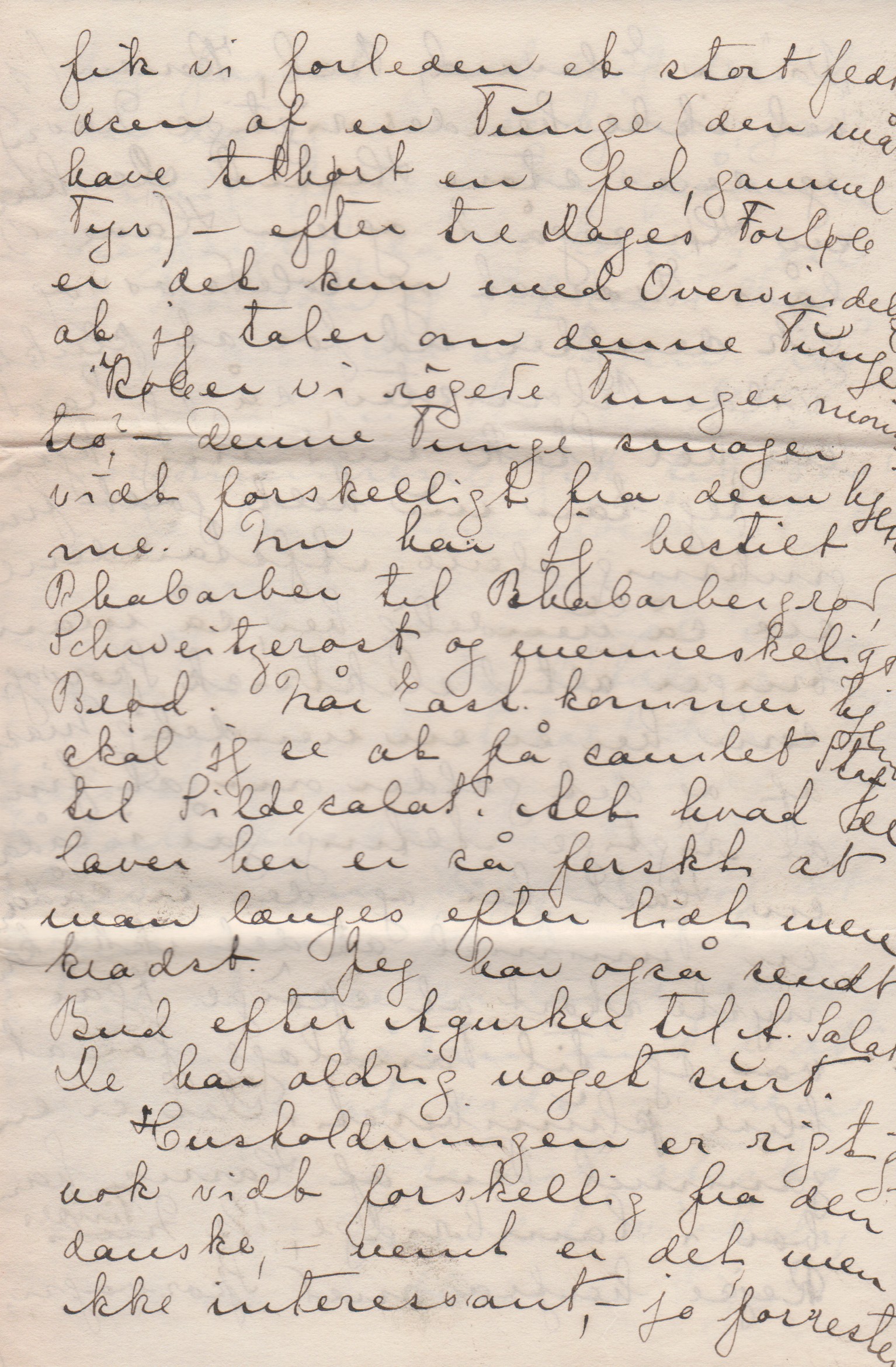 Der er adskillige Fordele ved at han kommer hjem igen, bl.a. den at vi så igen får spiselig Mad i Huset. – Når han ikke er her lever de mere ”amerikansk” og det er trættende i Længden. Bl.a. køber de så ikke Brød, men laver selv, - en Slags Tvebaksdejg, som jeg ikke ret godt kan få ned til Flæsk f. Eks. Der er så lidt Variation at man bliver så led og ked af alting, - de har i Reglen kun en Slags Mad i Huset som spises indtil der ikke er mere af det, - Morgen, Middag og Aften. Jeg kom til at foreslå en Oksetunge, og så fik vi forleden et stort fedt Asen af en Tunge (den må have tilhørt en fed, gammel Tyr) – efter tre Dages Forløb er det kun med Overvindelse at jeg taler om denne Tunge. Køber vi røgede Tunger monstro? Denne Tunge smager vidt forskelligt fra dem hjemme. Nu har jeg bestilt Rhabarber til Rhabarbergrød, Schweizerost og menneskeligt Brød. Når East. kommer hjem skal jeg se at få samlet Stof til Sildesalat. Alt hvad de laver her er så ferskt at man længes efter lidt mere kradst. Jeg har også sendt Bud efter Agurker til A.Salat. De har aldrig noget surt.