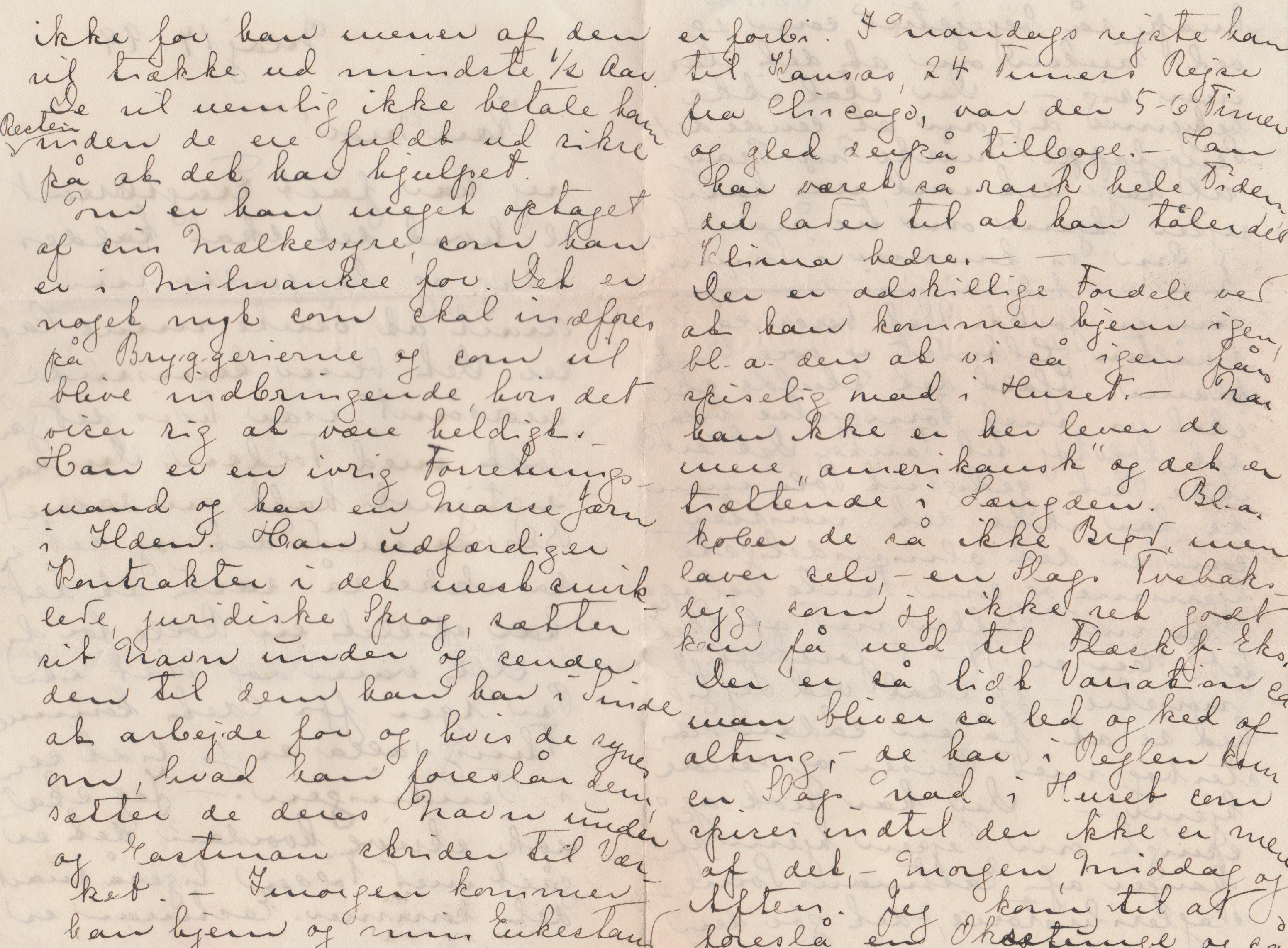 Nu er han meget optaget af sin Mælkesyre, som han er i Milwaukee for. Det er noget nyt, som skal indføres på Bryggerierne og som vil blive indbringende, hvis det viser sig at være heldigt. Han er en ivrig Forretningsmand og har en Masse Jærn i Ilden. Han udfærdiger Kontrakten i det mest snørklede, juridiske Sprog, sætter sit Navn under og sender den til dem han har i Sinde at arbejde for og hvis de synes om, hvad han foreslår dem, sætter de deres Navn under og Eastman skrider til Værket. – Imorgen kommer han hjem og min Enkestand er forbi. I Mandags rejste han til Kansas, 24 Timers Rejse fra Chicago, var der 5-6 Timer og gled derpå tilbage. - Han har været så rask hele Tiden, det lader til at han tåler det Klima bedre. – -