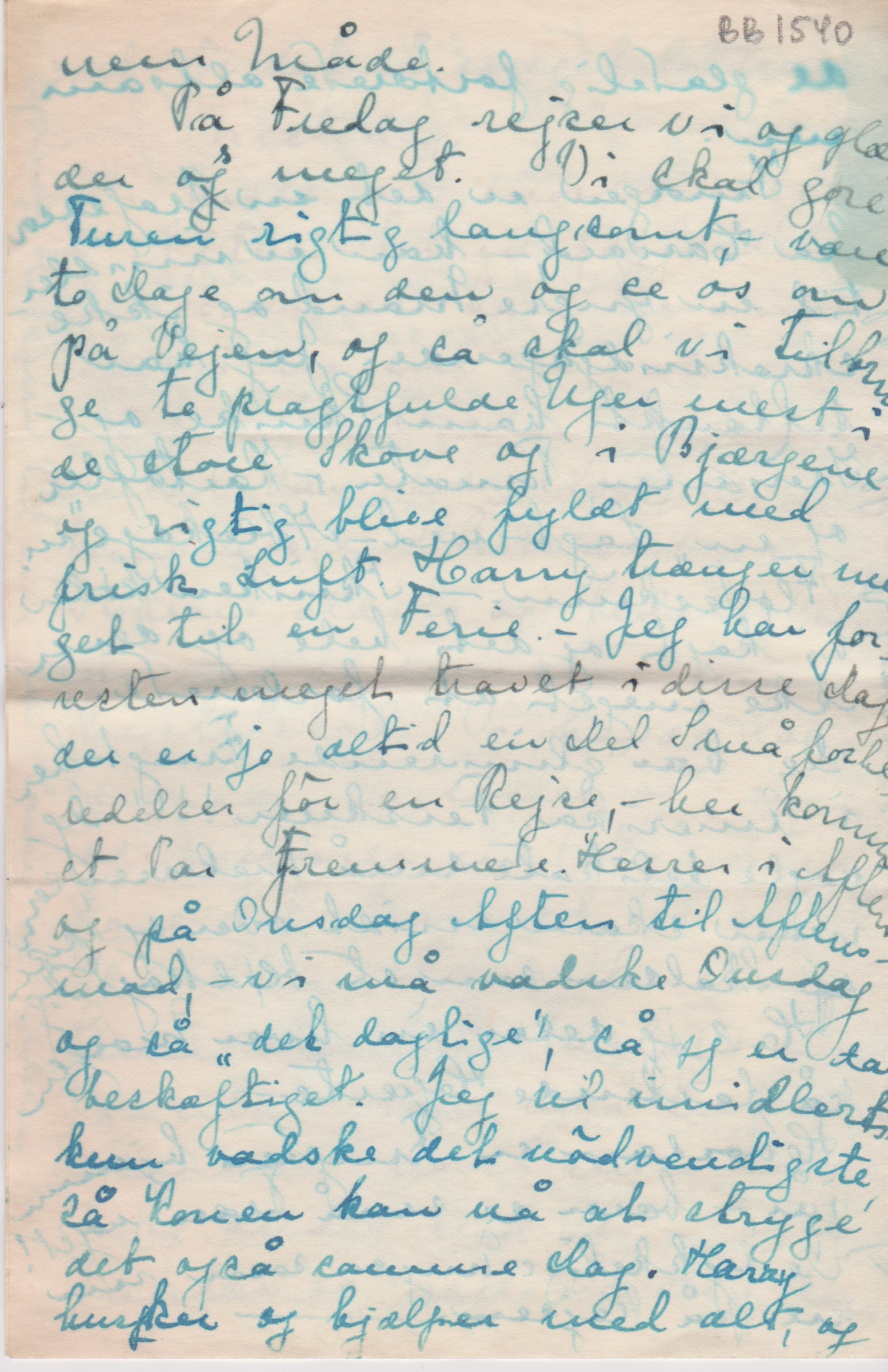 På Fredag rejser vi og glæder os meget. Vi skal gøre Turen rigtig langsomt, - være to Dage om den og se os om på Vejen, og så skal vi tilbringe to pragtfulde Uger mest i de store Skove og se Bjærgene og rigtig blive fyldt med frisk Luft. Harry trænger meget til en Ferie. – Jeg har forresten meget travet i disse Dage, der er jo altid en Del Småberedelser før en Rejse, - her kommer et par fremmede Herrer i Aften og på Tirsdag Aften til Aftensmad, - vi må vadske Onsdag og så ”det daglige”, så jeg er da beskæftiget. Jeg vil imidlertid kun vadske det nødvendigste, så Konen kan nå at stryge det også samme Dag. Harry husker og hjælper med alt, og det går det så meget lettere.