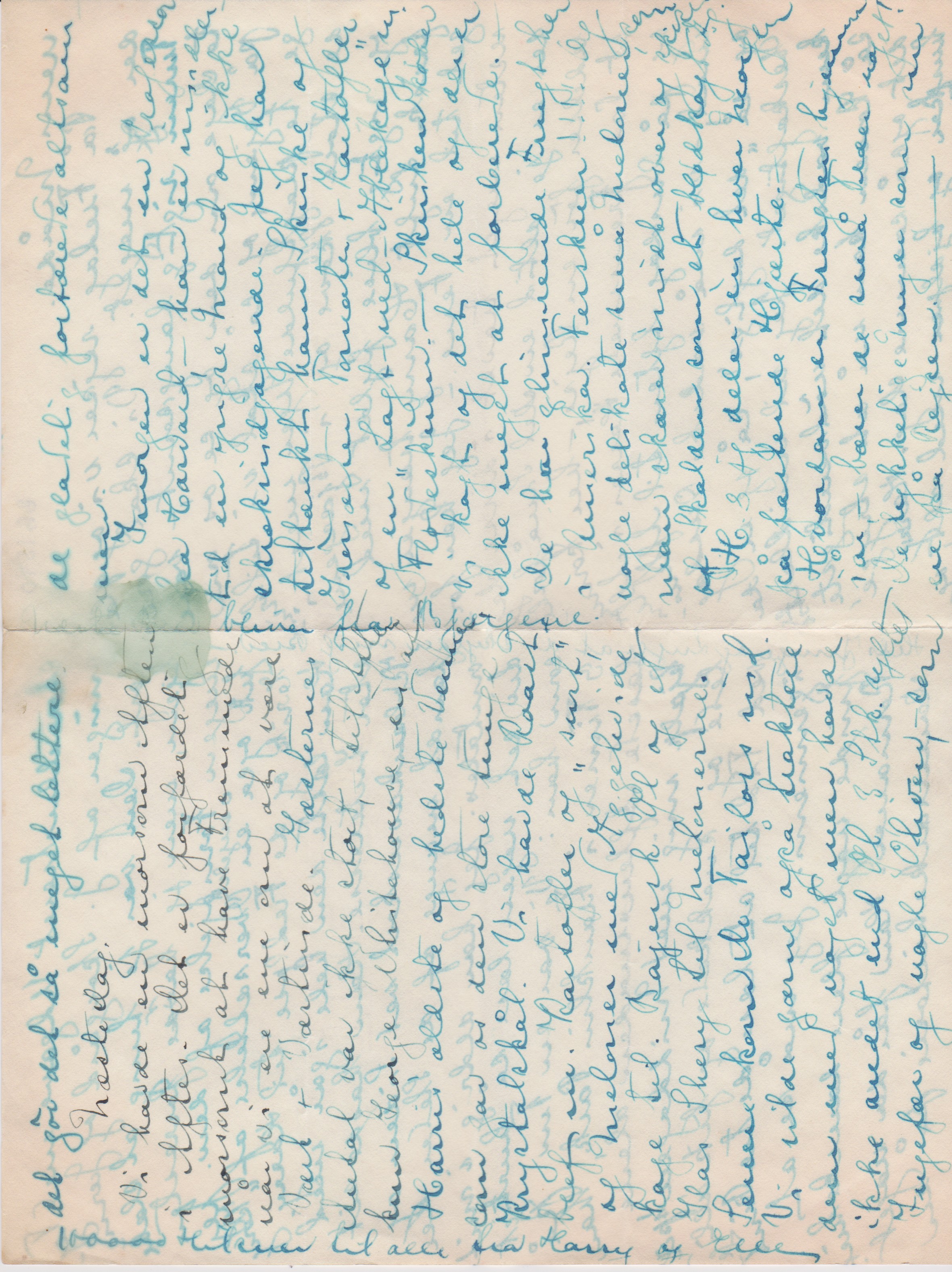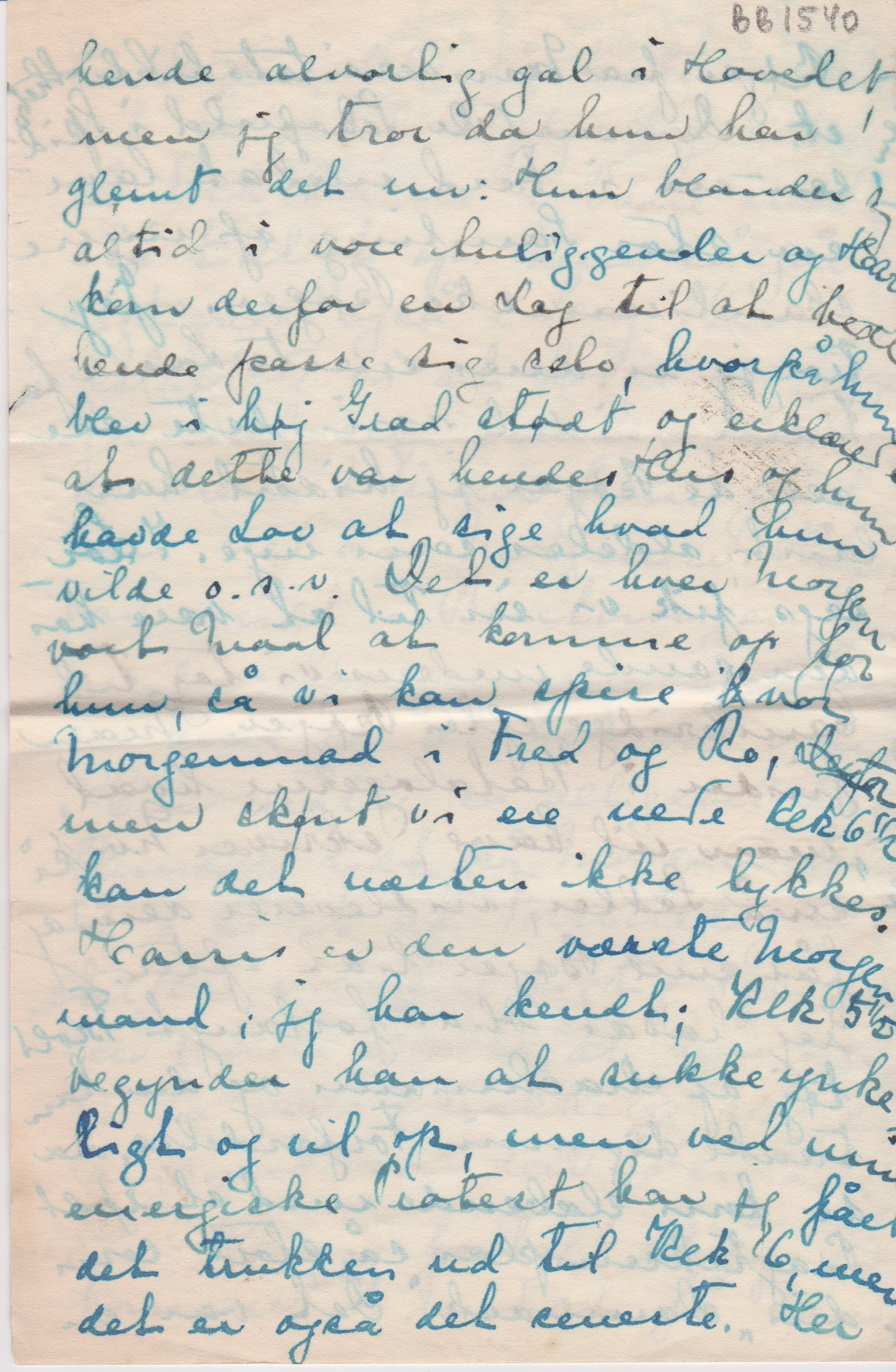 Min Uge, siden jeg skrev sidst har ikke været synderlig indholdsrig. Jeg har måttet holde mig hjemme for at passe på den gamle som aldrig tør være alene i Huset, men forresten har jeg nydt at være alene om Styret. (Jeg ved ikke hvad det er med Harris’ Moder, - man bliver så bundmelankolsk ved at være sammen med hende. Jeg tror det smitter. Jeg har været som et andet Menneske i denne Uge, skønt Guderne skal vide, at den gl. Bedstemoder ikke er opmuntrende. Hun grumler og gnaver altid og er ret utålelig. En Dag fik vi hende alvorlig gal i Hovedet, men jeg tror da hun har glemt det nu: Hun blander sig altid i vore Anliggender og Harris kom derfor en Dag til at bede hende passe sig selv, hvorpå hun blev i høj Grad stødt og erklærede at dette var hendes Hus og hun havde Lov til at sige hvad hun vilde o.s.v. Det er hver Morgen vort Maal at komme op før hende så vi kan spise vor Morgenmad i Fred og Ro, derfor ["derfor" overstreget] men skønt vi ere nede Klk 6½ kan det næsten ikke lykkes. Harris er den værste Morgenmand; jeg har kendt; Klk 5½ begynder han at sukke ynkeligt og vil op, men ved min energiske Protest har jeg fået det trukken ud til Klk 6, men det er også det seneste. Her ere Dagene ikke så korte om Vinteren, det er altid højlys Dag Klk 6, så Folk her ere i Vane med at stå tidligt op. Men så går vi rigtignok også i Seng 9½. Igår besluttede vi at holde de ["de" overstreget] lidt Sjov med de gamle: Vi stillede Urene 2 Timer frem før hun kom ned om Morgenen. Hun var midt i Beretningen om en søvnløs, gennemvåget Nat, da hun så at Klk var over 10. ”Hun måtte så alligevel have blundet lidt på Morgenstunden”. Så i Løbet af Morgenstunden stillede vi Urene rigtig igen, og den gamle mente, at hun måtte være skrækkelig syg, så langsom den Formiddag gik. Har ej fortalt, at jeg er kommet i med at få danske Bøger fra Universitetsbiblioteket. De, - med Dr. Schofield i Spidsen – ere i Færd med at lave en stor Samling af nyere skandinaviske Bøger. Jeg tror, jeg er deres eneste Læser for Tiden – i det mindste ere alle de Bøger jeg hidtil lånt aldeles som nye. I Lørdags fik vi èn til at være hos den gamle, medens vi tog til Cambridge efter Bøger. Man finder i Katalogerne hvad man vil have, skriver No. på små Sedler, indleverer dem og får sine Bøger lidt efter. Jeg havde bl.a. forlangt Troldtøj af Drachmann og du kan tænke dig min Forfærdelse, da de kom slæbende med et rødt Pragteksemplar så stort som din ”Danmark” Det var en stor illustreret Udgave med Tegninger af J. Skovgård og Jerndorff. Den var jo tung at slæbe hjem, men jeg havde forresten megen Glæde af den. Jeg fik også en engelsk [”engelsk” indsat over linjen] Oversættelse af ”Kong Erik og de Fredløse” til Harry. Han læste den hele igår med stor Interesse. Han havde sit Københavnerkort ved Siden og fandt mange af de Steder der omtales. Jeg har aldrig i mit Liv set nogen læse så hurtigt som han: Vi var et Tur på 3 Timer i Franklin Park, han lavede Aftensmaden alene, hjalp mig med Middagsmaden, spillede og snakkede og fik alligevel Tid til at læse de tre Bind igennem. Jeg må se at finde nogle flere danske hist. Romaner. Han får da noget Danmarkshistorie på en nem Måde.