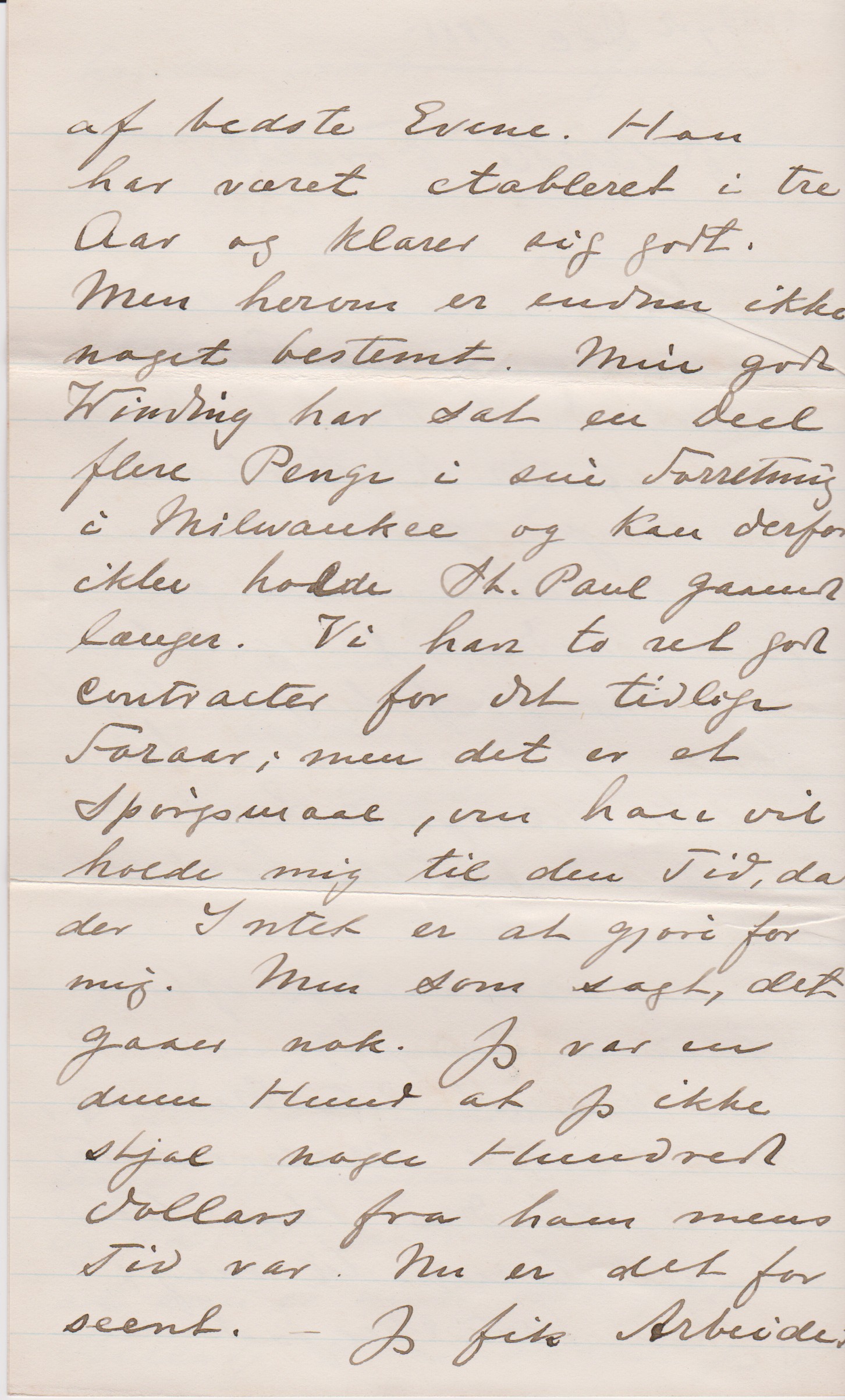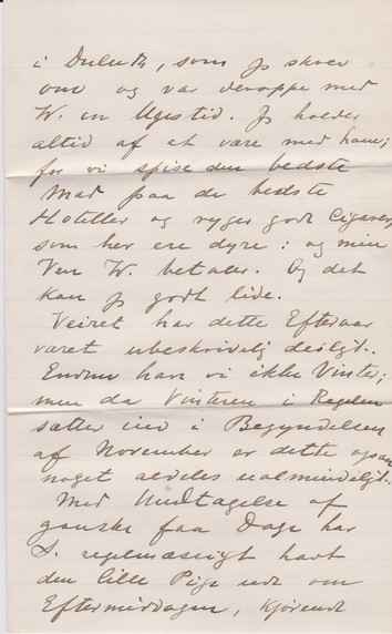 Muligvis gaaer jeg efter Nytaar i Compagni med min Ven H. Peter Nielsen, velbestaltet Malermester her i Staden. Han troer, han trænger til mig; og heri bestyrker jeg ham af bedste Evne. Han har været etableret i tre Aar og klarer sig godt. Men herom er endnu ikke noget bestemt. Min gode Winding har sat en Deel flere Penge i sin Forretning i Milwaukee og kan derfor ikke holde St. Paul gaaende længere. Vi har to ret gode Contracter for det tidlige Foraar; men det er et Spørgsmaal, om han vil holde mig til den Tid, da der Intet er at giøre for mig. Men som sagt, det gaaer nok. Jeg var en dum Hund at jeg ikke stjal nogle Hundreder Dollars fra ham mens Tid var. Nu er det for sent. – Jeg fik Arbeidet i Duluth, som jeg skrev om og var deroppe med W. en Ugestid. Jeg holder altid af at være med ham; for vi spise den bedste Mad paa de bedste Hoteller og ryge gode Cigarer, som her ere dyre. Og min Ven W betaler. Og det kan jeg godt lide.