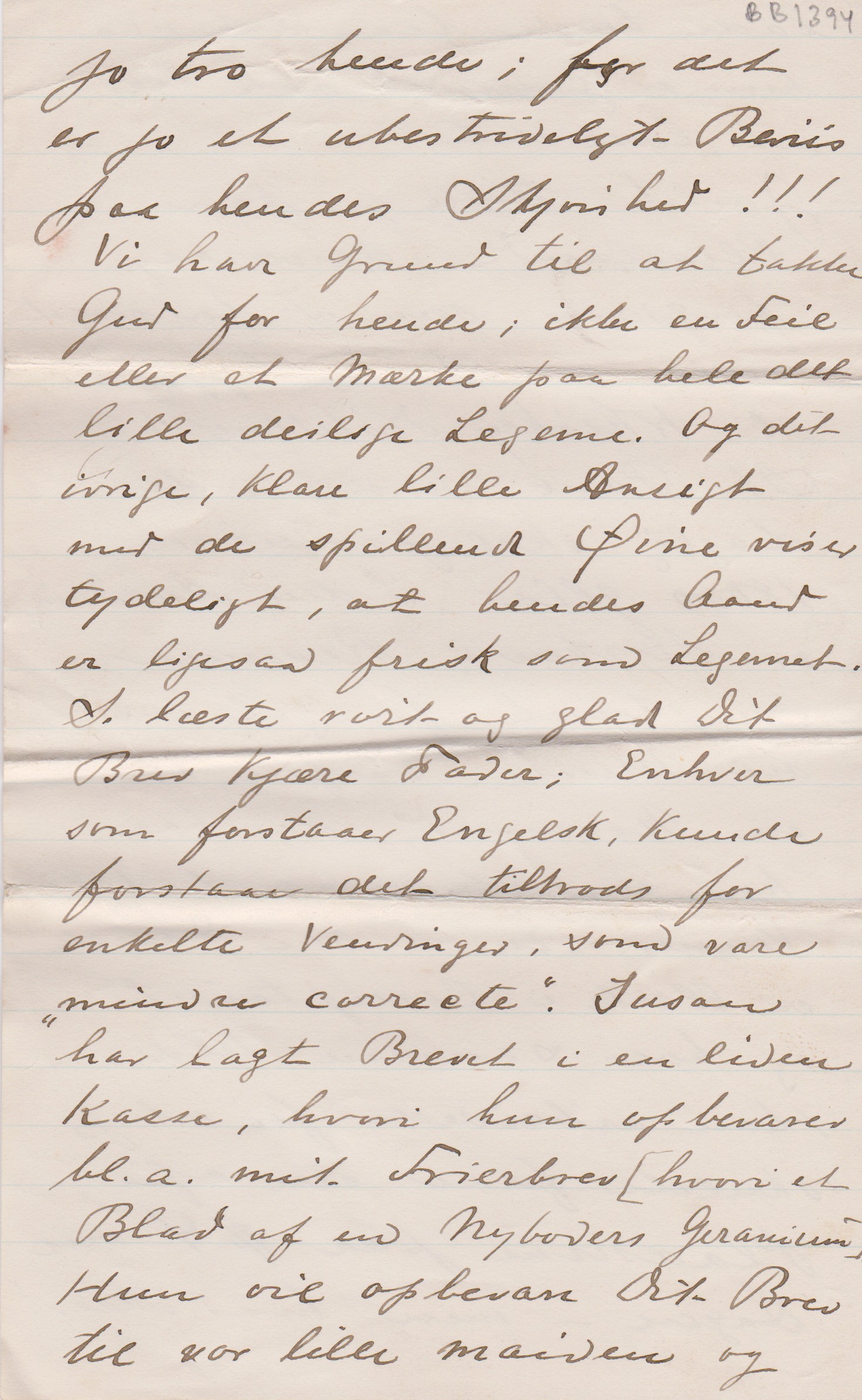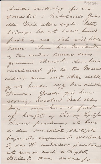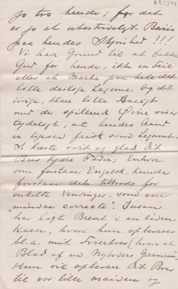 Med Undtagelse af ganske faa Dage har S. regelmæssigt havt den lille Pige med om Eftermiddagen, kjørende hende omkring for en Timestid i Nabolavets Gader eller Veie rettere sagt. Dette bidrager til at holde hende frisk og vel, det søde og lille Væsen. Hun har tre Tænder og tre andre kunne sees gjennem Skindet. Hun blev vaccineret for to – tre Maaneder siden; men end ikke dette gjorde hende syg den mindste Smule. Grædee gjør hun aldrig, hverken Nat eller Dag - men hun er fuld af Kraft og Liv og Lystighed. Susan paastaaer, at hun er den smukkeste, deiligste Unge, der nogensinde existerede. Og da S. endvidere paastaaer, at hun er mit udtrykte Billed, saa maa jeg jo troe hende; for det er jo et ubestrideligt Beviss paa hendes Skjønhed. Vi har Grund til at takke Gud for hende; ikke en Feil eller et Mærke paa hele det lille deilige Legeme. Og det ivrige, klare lille Ansigt med de spillende Øine viser tydeligt, at hendes Aand er ligesaa frisk som Legemet. S læste rørt og glad Dit Brev kjære Fader; Enhver som foorstaar Engelsk, kunde forstaa det tiltrods for enkelte Vendinger, som var "mindre correcte". Susan har lagt Brevet i en liden Kasse, hvori hun opbevarer bl.a. mit Frierbrev (hvori et Blad af en Nyboders Geranium). Hun vil opbevare Dit Brev til vor lille maiden og lade hende faa det, naar hun er gammel nok til at læse det.