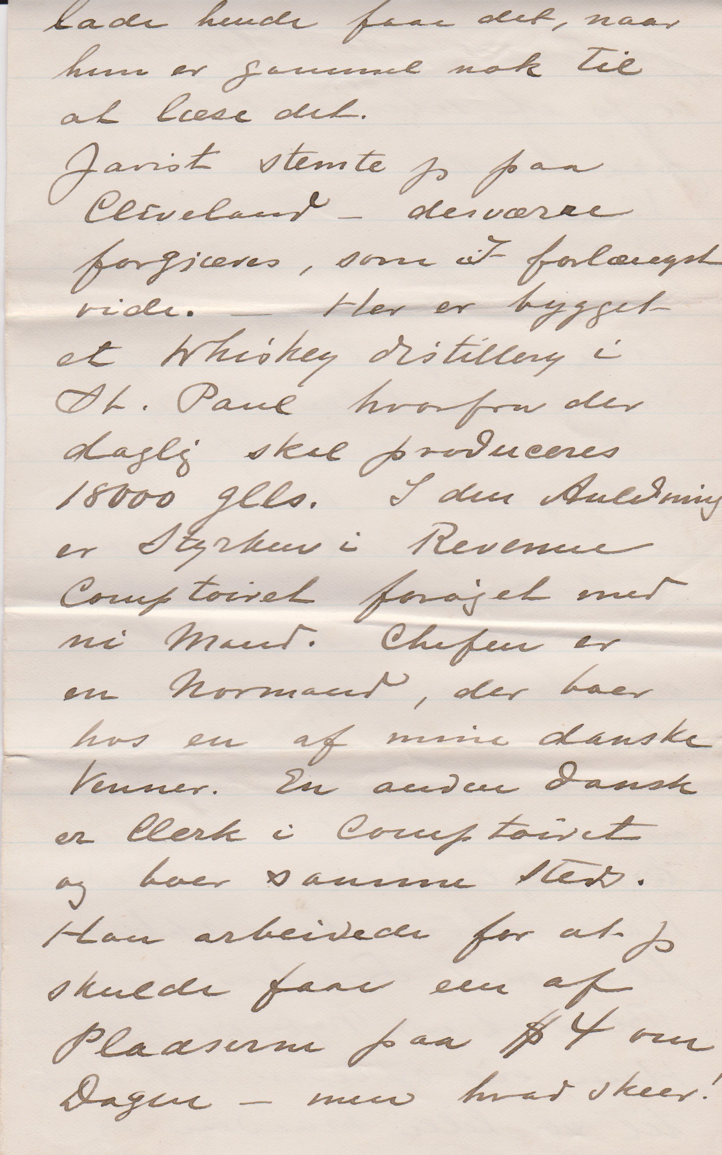 Jovist stemte jeg paa Cleveland – desværre forgjæves, som I for længst vide. – Her er bygget et Whiskey distillery i St. Paul hvorfra der daglig skal produceres 18000 glls. I den Anledning er Styrken i Revenue Comptoiret forøget med ni Mand. Chefen er en Nordmand, der boer hos en af mine danske Venner. En anden dansk er Clerk i Comptoiret og boer samme Sted. Han arbeidede for at jeg skulde faae en af Pladserne paa $ 4 om Dagen – men hvad skeer!