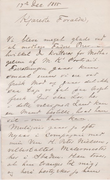 Vi bleve meget glade ved at modtage Faders Brev, i hvilket Du kvitterer for Modtagelsen af M. Ks Portrait. Forretningen gaaer kun smaat men vi ere ved frisk Mod og gaaer det ikke saa tager vi fat paa noget frisk. Gud ske Lov, her i dette velsignede Land kan en Mand bestille, hvad han vil – om han kan.