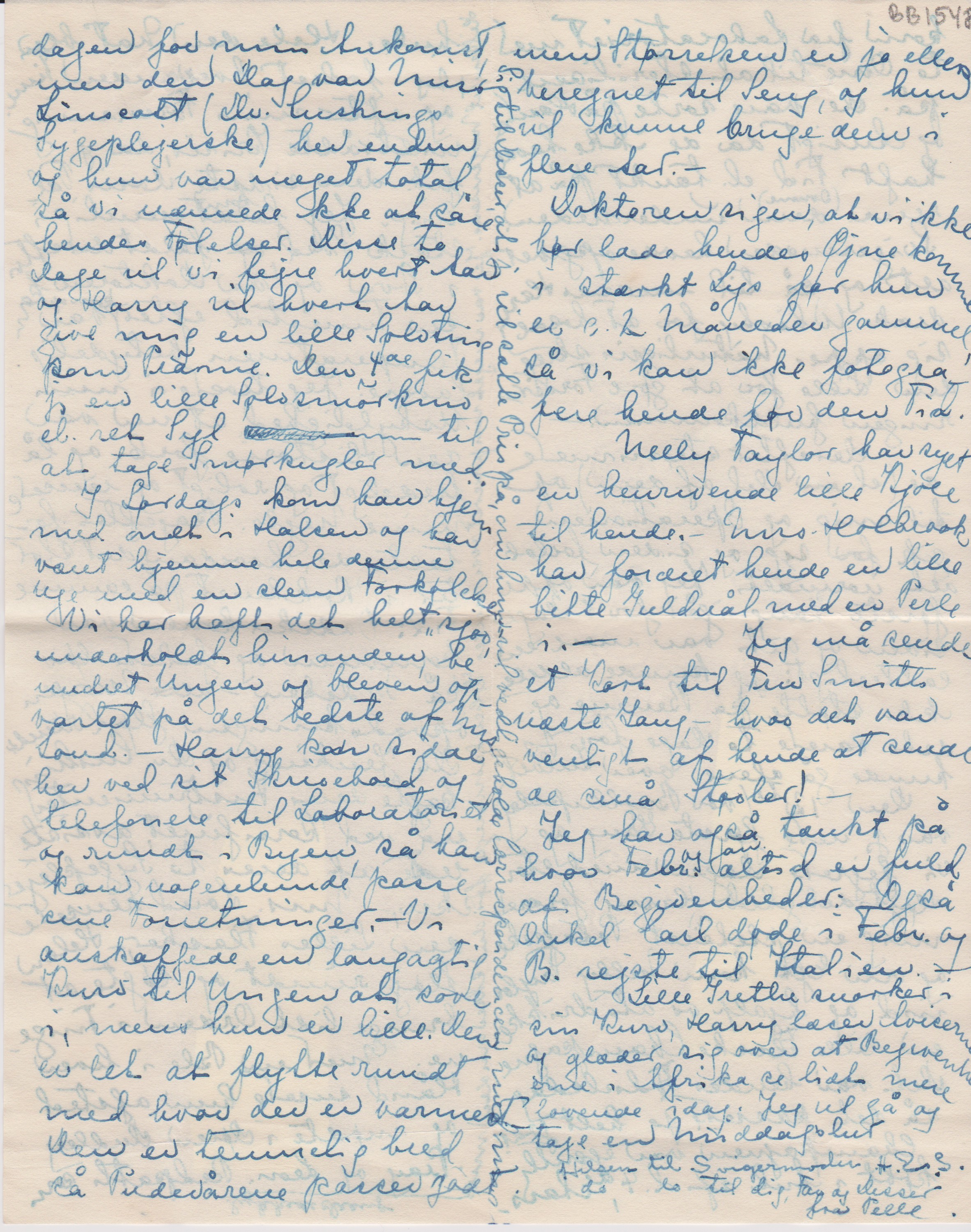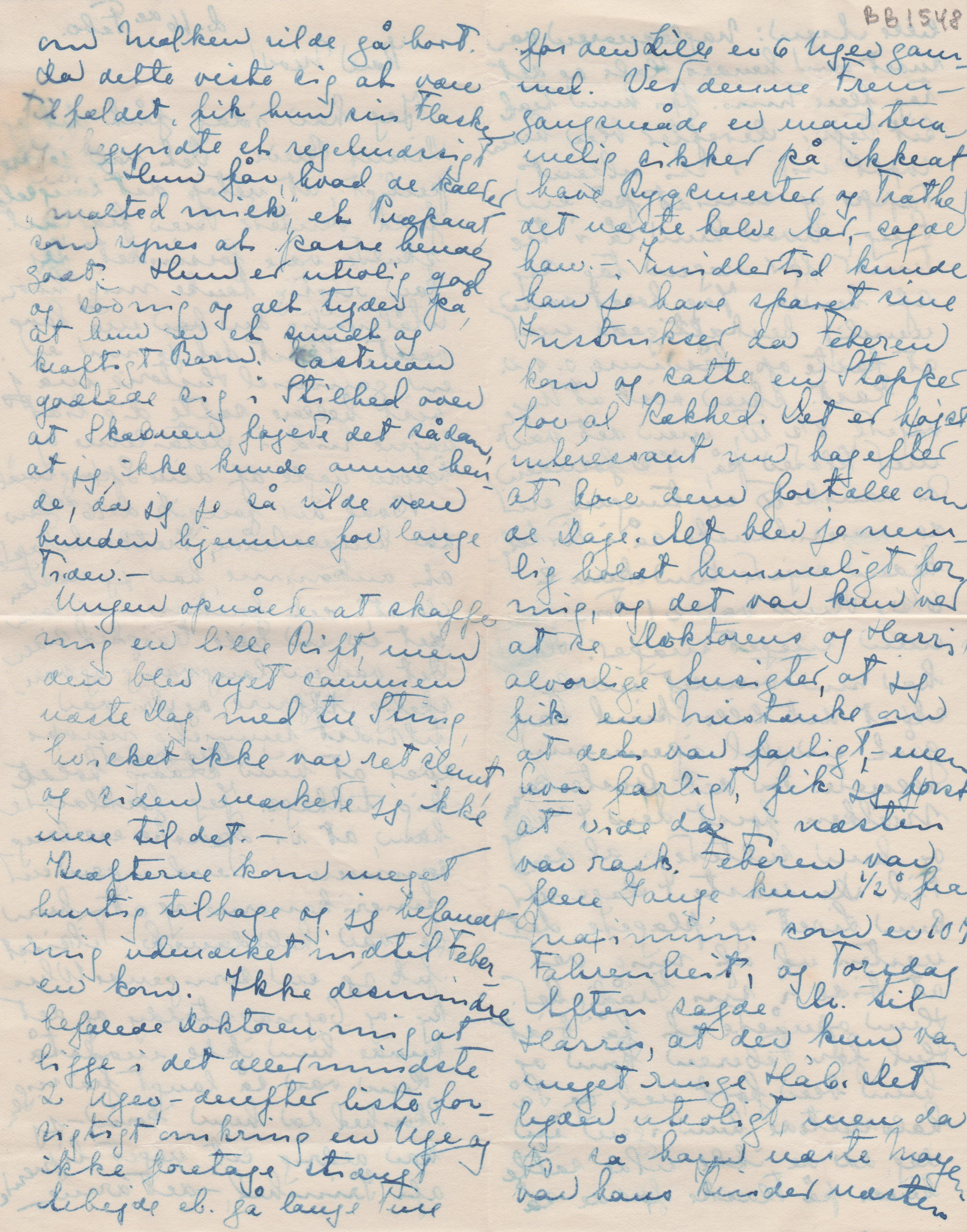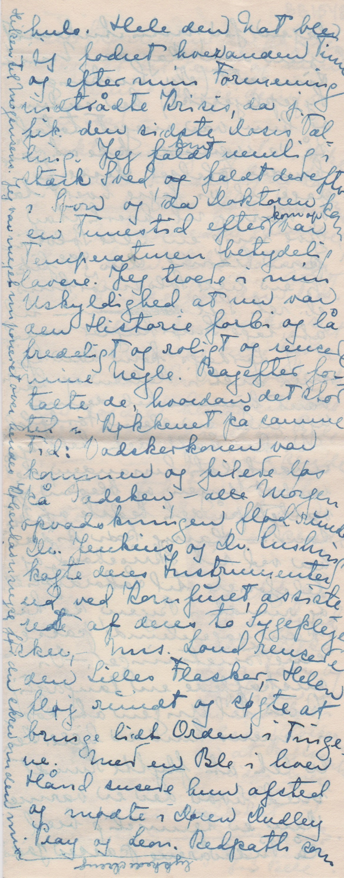 Kræfterne kom meget hurtig tilbage og jeg befandt mig udmærket indtil Feberen kom. Ikke desmindre befalede Doktoren mig at ligge i det allermindste 2 Uger – derefter liste forsigtigt omkring en Uge og ikke foretage strængt Arbejde el. gå lange Ture før den lille er 6 Uger gammel. Ved denne Fremgangsmåde er man temmelig sikker på ikke at have Rygsmerter og Træthed det næste halve Aar, sagde han. – Imidlertid kunde han jo have sparet sine Instrukser, da Feberen kom og satte en Stopper for al Kækhed. Det er højst interessant nu bagefter at høre dem fortælle om de Dage. Det blev jo nemlig holdt hemmeligt for mig, og det var kun ved at se Doktorens og Harris’ alvorlige Ansigter, at jeg fik en Mistanke om at det var farligt, - men hvor farligt fik jeg først at vide da jeg næsten var rask. Feberen var flere Gange kun ½ ° fra Maximum, som er 107 Fahrenheit, og Torsdag Aften sagde Dr. til Harris, at der kun var meget ringe Håb. Det lyder utroligt, men da jeg så ham næste Morgen var hans Kinder næsten hule. Hele den Nat blev jeg fodret hveranden Time og efter min Formening trådte Krisen ind, da jeg fik den sidste Dosis Vælling. Jeg faldt ["faldt" overstreget] kom nemlig i stærk Sved, og faldt derefter i Søvn og da Doktoren kom en Times Tid efter kom op [”kom op” indsat over linjen] var Temperaturen betydelig lavere. Jeg troede i min Uskyldighed, at nu var den Historie forbi og lå fredelig og roligt og rensede mine Negle. Bagefter fortalte de, hvordan det stod til i Køkkenet på samme Tid: Vadskekonen var kommen og filede løs på Vadsken, - alle ["le" sidst i ordet overstreget] Morgenvadskningen flød rundt Dr. Jenkins og Dr. Cushing kogte deres Instrumenter ude ved Komfuret, assisteret af deres to Sygeplejersker, - Mrs. Loud rensede den lilles Flasker, - Helen fløj rundt og søgte at bringe lidt Orden i Tingene. Med en Ble i hver Hånd susede hun afsted og mødte i Døren Dudley Pray og Leon. Redpath som kom fra Laboratoriet med to Ovne til at sterilisere på. De var sorte på Hænder og Ansigt, da de ikke havde haft Tid el. tænkt på at rense dem (Ovnene) [”(Ovnene)" indsat over linjen] underneden. Svigermoder havde opgivet alt og så til, medens Harry drak Whisky for at holde sig oppe. Naturligvis skreg den lille for at gøre Forvirringen fuldkommen. –