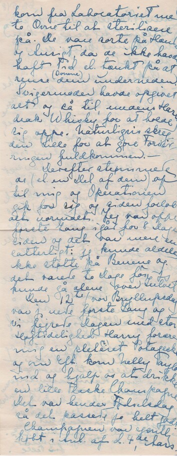 Derefter strømmede de (el. en Del af dem) op til mig og Operationen gik for sig og siden forløb alt normalt. Jeg var oppe første Gang igår for 8 Dage siden og det var mere end latterligt: jeg kunde aldeles ikke støtte på Benene og det varede to Dage før jeg kunde gå alene over Gulvet.
