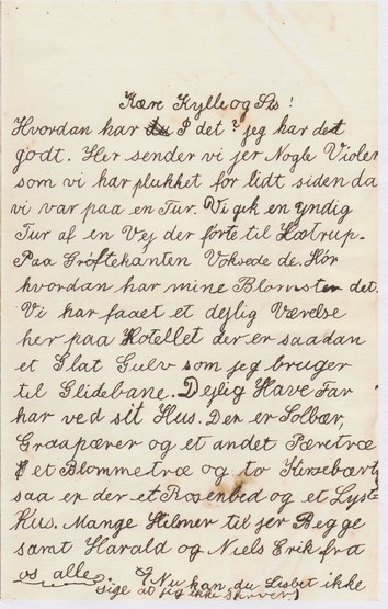 Hvordan har du ["du" overstreget] I det? jeg har det godt. Her sender vi jer Nogle Violer som vi har plukket for lidt siden da vi var paa en Tur. Vi gik af en yndig Tur af en Vej der førte til Hostrup. Paa Grøftekanten voksede de. Hør hvordan har mine Blomster det. Vi har faaet et dejligt Værelse her paa Hotellet der er saadan et Glat Gulv som jeg bruger som Glidebane. Dejlig Have Far har ved sit Hus. Der er Solbær, Graapærer og et andet Pæretræ E ["E" overstreget] et Blommetræ og to Kirsebærtræ saa er der et Rosenbed og et Lysthus. Mange Hilsner til Jer Begge samt Harald og Niels Erik fra os alle.