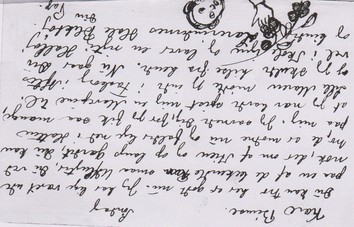 Du kan tro her er godt nu. Jeg har lige været ude paa en af de bekendte Rom ["Rom" overstreget] smaa Udflugter, Du ved nok, der om ad Stien og op langs Gærdet, Du kan tro, de er modne nu og falder lige ned i Hatten paa mig. Jeg savnede Dig, for jeg fik saa mange, at jeg nær havde spist mig en Mavepine til. Lille Maren mødte jeg inde i Faaborg i Aftes og jeg skulde hilse fra hende. Nu gaar Du vel i Skole igen og laver en rigtig Halløj og binder Lærerindernes Hale Bliktøj.