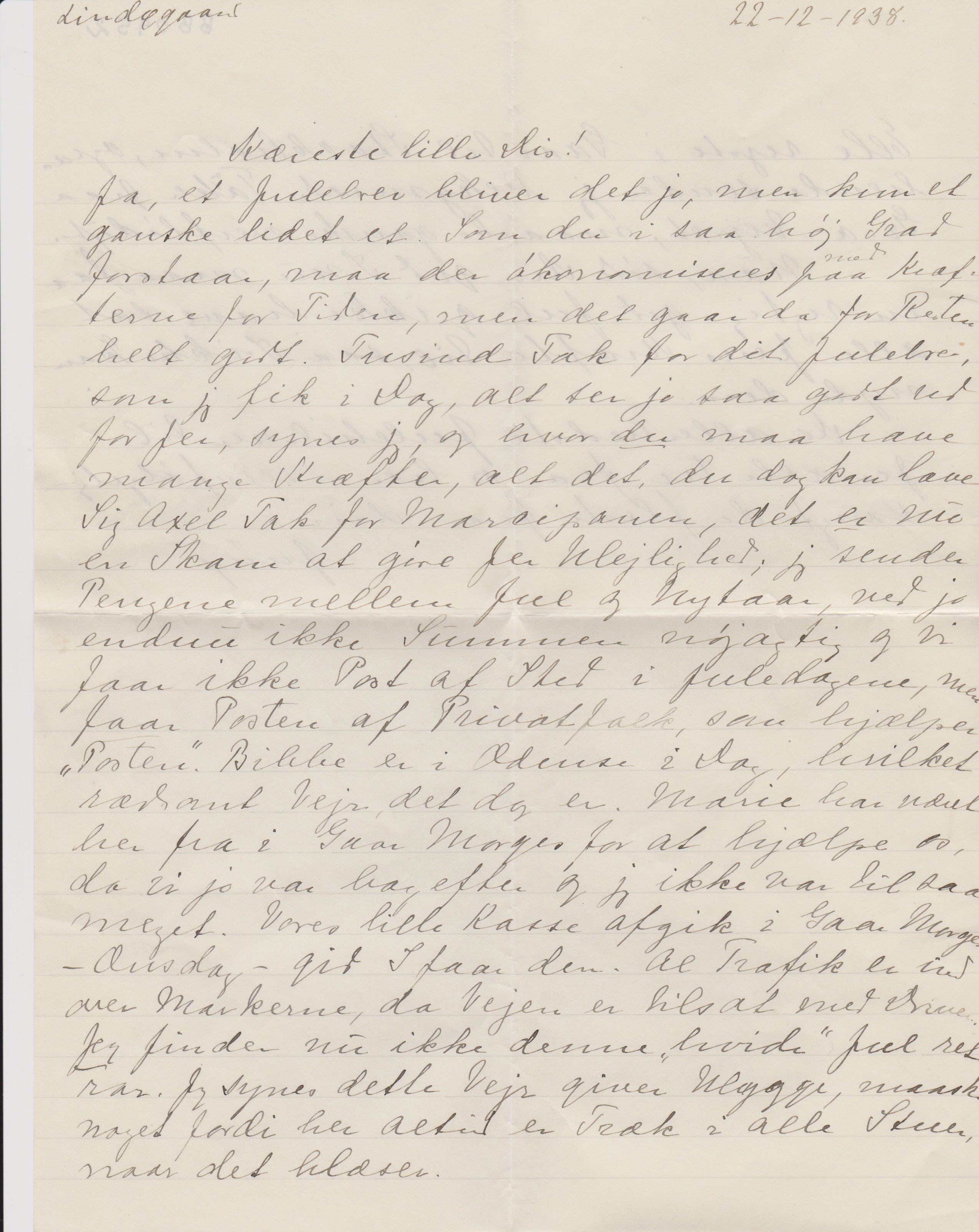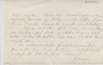 Ja, et Julebrev bliver det jo, men kun et ganske lidet et. Som du i saa høj Grad forstaar, maa der økonomiseres paa med [”med” indsat over liljen] Kræfterne for Tiden, men det gaar da for Resten helt godt. Tusind Tak for dit Julebrev, som jeg fik i Dag, alt ser jo saa godt ud for Jer, synes jeg, og hvor du maa have mange Kræfter, alt det, du dog kan lave Sig Axel Tak for Marcipanen, det er nu en Skam at gøre Jer Ulejlighed; jeg sender Pengene mellem Jul og Nytaar, ved jo endnu ikke Summen nøjagtig og vi faar ikke Post af Sted i Juledagene, men faar Posten af Privatfolk, som hjælper ”Posten”. Bibbe er i Odense i Dag, hvilket rædsomt Vejr, det dog er. Marie har været her fra i Gaar Morges for at hjælpe os, da vi jo var bag efter og jeg ikke var til saa meget. Vores lille Kasse afgik i Gaar Morges – Onsdag – gid I faar den. Al Trafik er ind over Markerne, da Vejen er tilsat med Driver. Jeg finder nu ikke denne ”hvide” Jul ret rar. Jeg synes dette Vejr giver Uhygge, maaske noget fordi her altid er Træk i alle Stuer, naar det blæser.