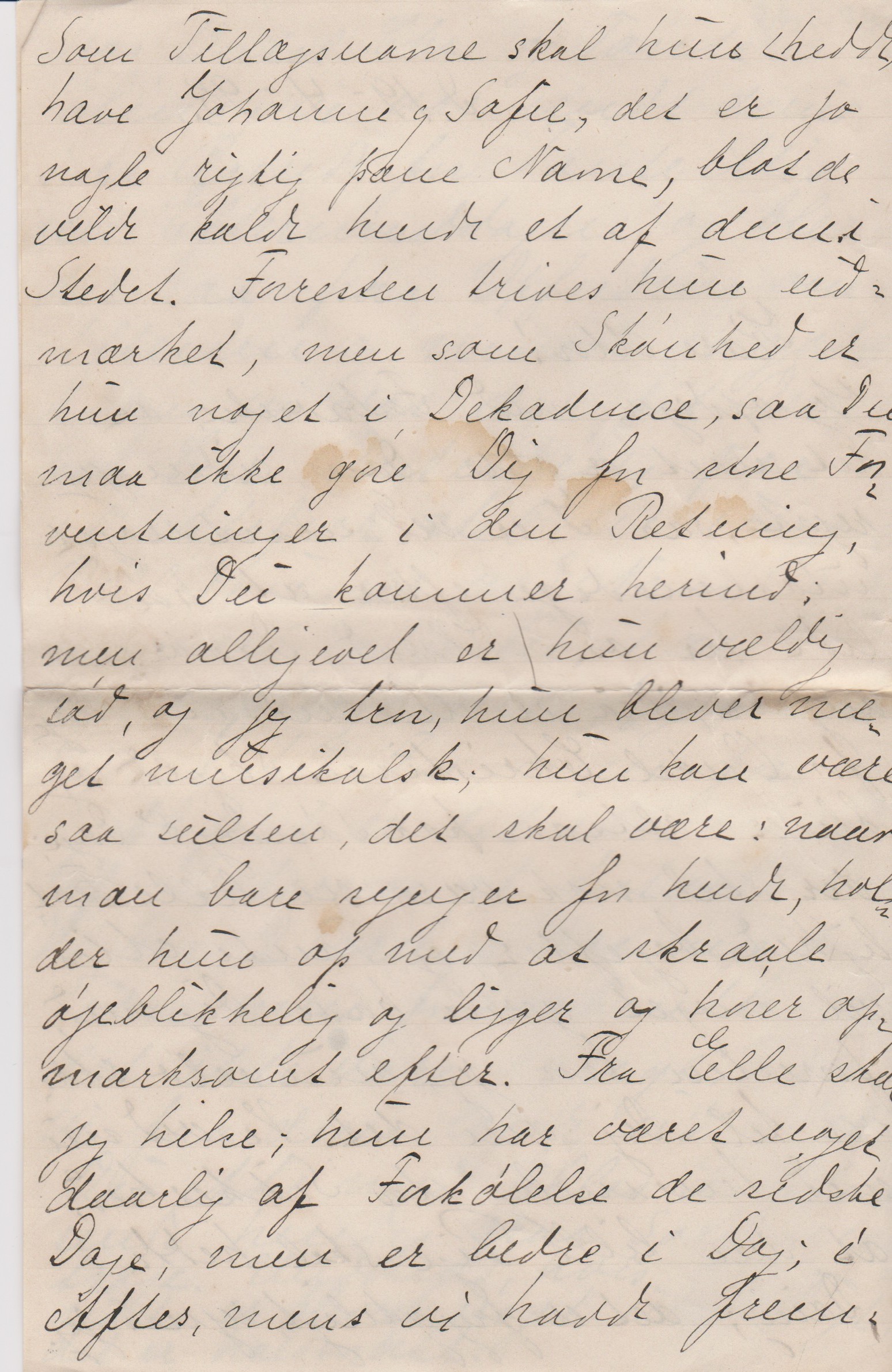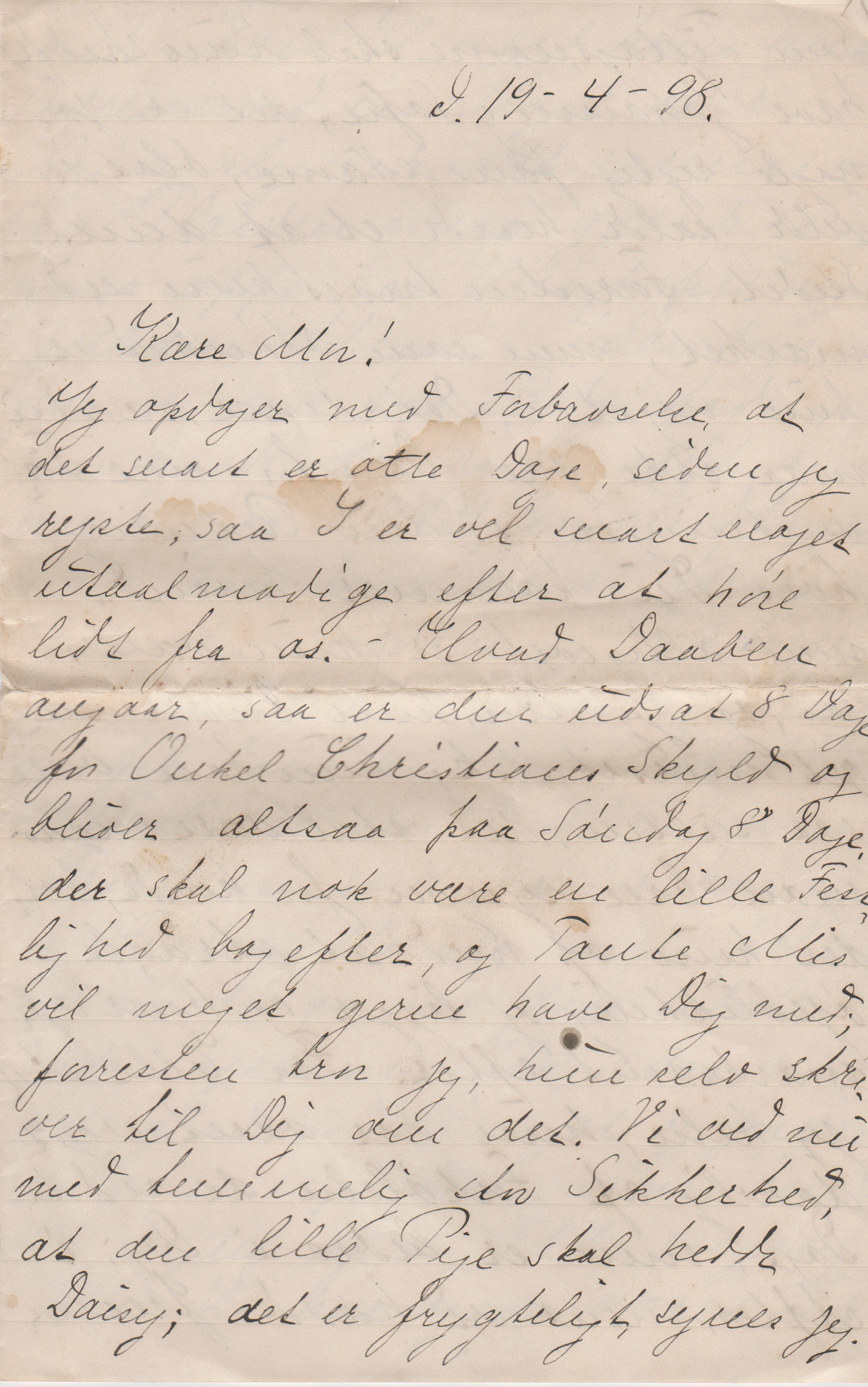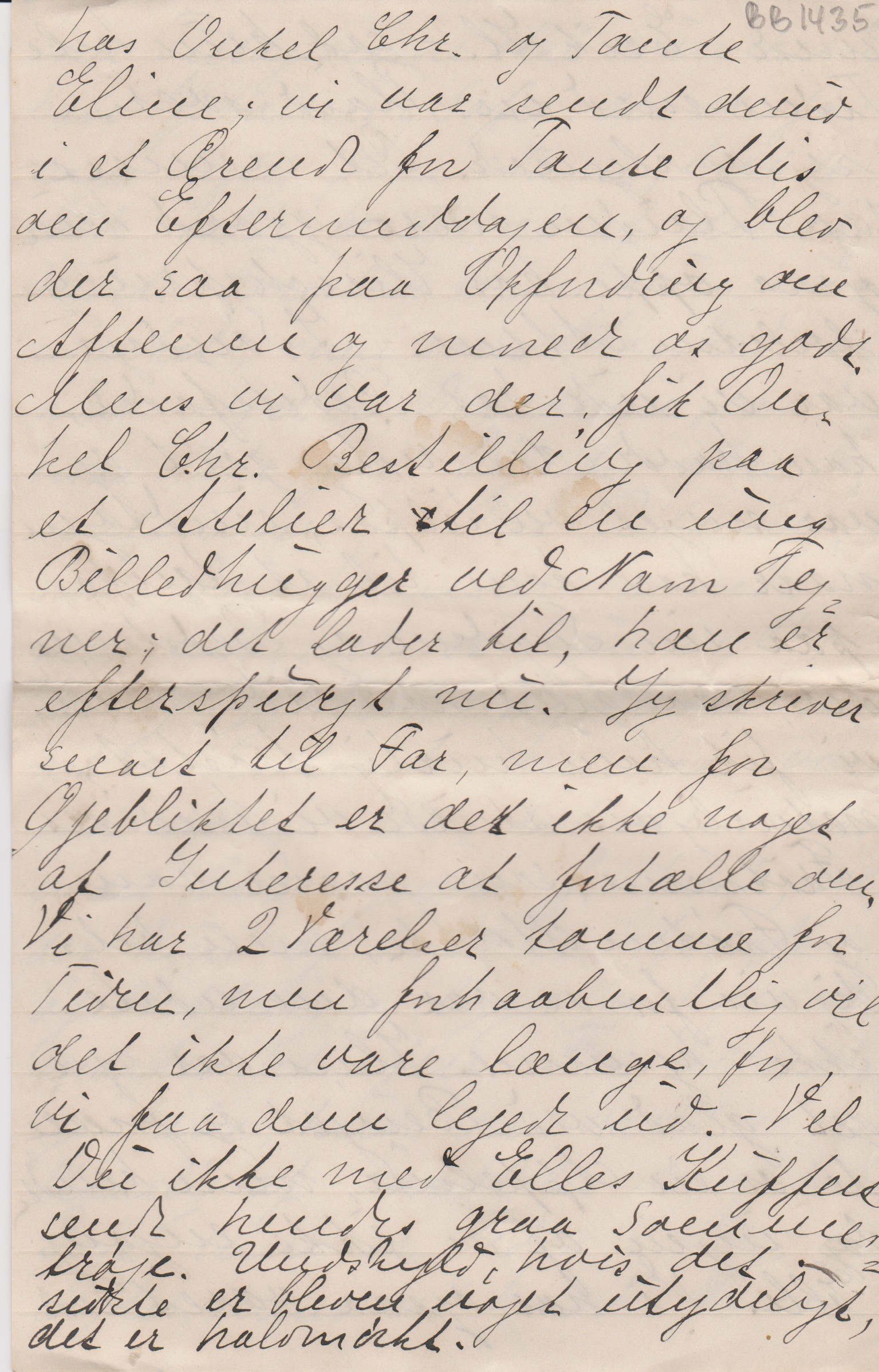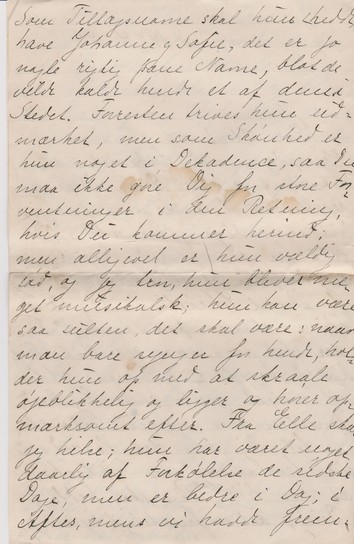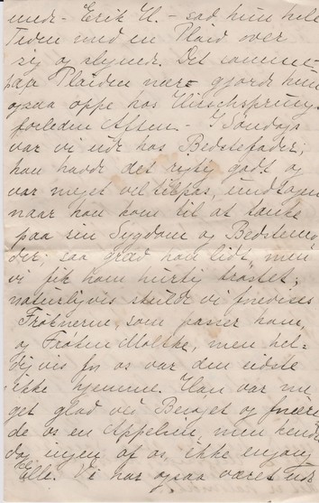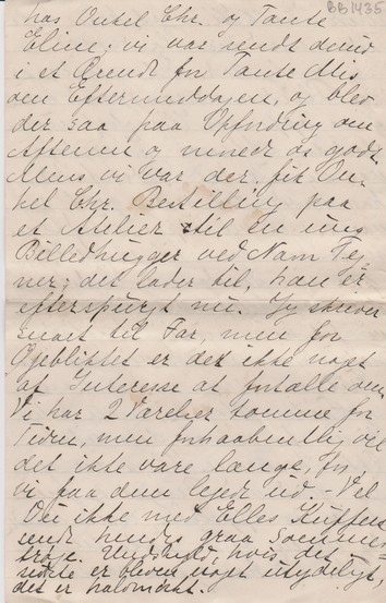 Jeg opdager med Forbavselse, at det snart er otte Dage siden jeg rejste, saa I er vel snart noget utaalmodige efter at høre lidt fra os. – Hvad Daaben angaar, saa er den udsat 8 Dage for Onkel Christians Skyld og bliver altsaa paa Søndag 8 Dage; der skal nok være en lille Festlighed bagefter, og Tante Mis vil meget gerne have Dig med; forresten tror jeg, hun selv skriver til Dig om det. Vi ved nu med temmelig stor Sikkerhed, at den lille Pige skal hedde Daisy; det er frygteligt synes jeg. Som Tillægsnavne skal hun (hedde) have Johanne og Sofie, det er jo nogle rigtig pæne Navne, blot de vilde kalde hende et af disse i Stedet. Forresten trives hun udmærket, men som Skønhed er hun noget i Dekadence, saa Du maa ikke gøre Dig for store Forventninger i den Retning, hvis Du kommer herind; men alligevel er hun vældig sød, og jeg tror, hun bliver meget musikalsk: hun kan være saa sulten, det skal være; naar man bare synger for hende, holder hun op med at skraale øjeblikkelig og ligger og hører opmærksomt efter. Fra Elle skal jeg hilse; hun har været noget daarlig af Forkølelse de sidste Dage, men er bedre i Dag. I Aftes, mens vi havde Fremmed – Erik - sad hun hele Tiden med en Plaid over sig og slynede. Det samme paa Plaiden nær gjorde hun ogsaa oppe hos Hirschsprung forleden Aften. – I Søndags var vi ude hos Bedstefader; han havde det rigtig godt og var meget vel tilpas, undtagen naar han kom til at tænke paa sin Sygdom og Bedstemoder; saa græd han lidt, men vi fik ham hurtig trøstet; naturligvis skulde vi fremvises Frøknerne, som passer ham og Frøken Moltke, men heldigvis for os var den sidste ikke hjemme. Han var meget glad ved Besøget og forærede os en Appelsin, men kendte ingen af os, ikke engang Elle. Vi har også været ude hos Onkel Chr. og Tante Eline; vi var sendt derud i et Ærinde for Tante Mis om Eftermiddagen, og blev der saa paa Opfordring om Aftenen og mored os godt. Mens vi var der fik Onkel Chr. Bestilling paa et Atelier til en ung Billedhugger ved Navn Tejner; det lader til, han er efterspurgt nu, Jeg skriver snart til Far, men for Øjeblikket er der ikke noget af Interesse at fortælle om. Vi har to Værelser tomme for Tiden, men forhaabentlig vil det ikke vare længe, før vi faar denne lejet ud. – Vil Du ikke med Elles Kuffert sende hendes graa Sommertrøje: Undskyld, hvis det sidste er blevet noget utydeligt, det er halvmørkt.