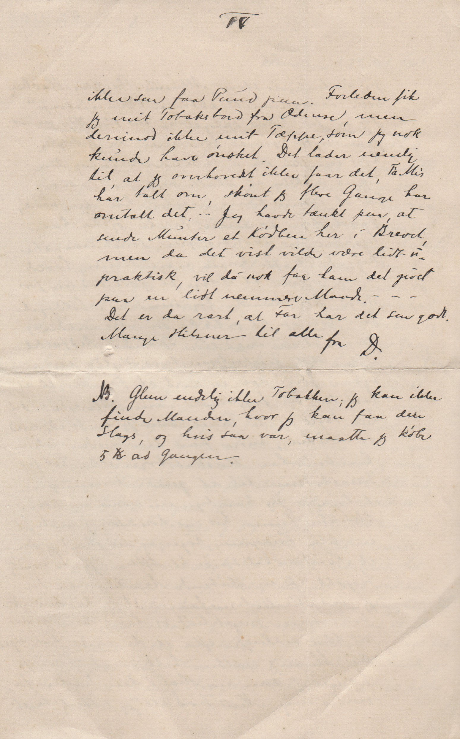 NB. Glem endelig ikke Tobakken; jeg kan ikke finde Manden, hvor jeg kan faa den Slags, og hvis saa var, maatte jeg købe 5 Kr ad Gangen.