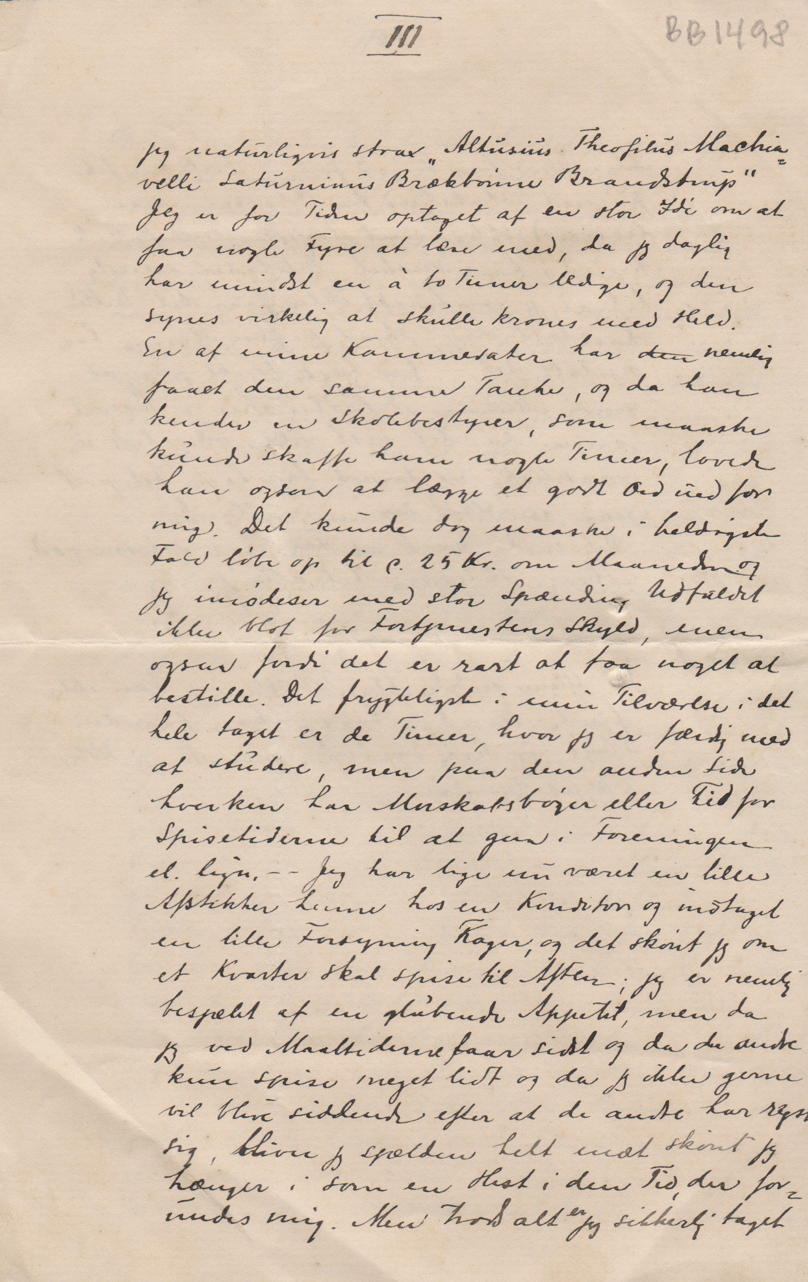 jeg naturligvis strax ”Altusius Theofilus Machiavelli Saturninus Brækbønne Brandstrup” Jeg er for Tiden optaget af en stor Idé om at faa nogle Fyre at læse med, da jeg daglig har mindst en á to Timer ledige, og den synes virkelig at skulle krones med Held. En af mine Kammerater har den ["den" overstreget] nemlig faaet den samme Tanke, og da han kender en Skolebestyrer, som maaske kunde skaffe ham nogle Timer, lovede han ogsaa at lægge et godt Ord ind for mig. Det kunde dog maaske i heldigste Fald løbe op til c. 25 Kr. om Maaneden og jeg imødeser med stor Spænding Udfaldet ikke blot for Fortjenestens Skyld, men ogsaa fordi det er rart at faa noget at bestille. Det frygteligste i min Tilværelse i det hele tager er de Timer, hvor jeg er færdig med at studere, men paa den anden Side ikke hverken har Morskabsbøger eller Tid for Spisetiderne til at gaa i Foreningen el. lign. - - Jeg har lige været en lille Afstikker henne hos en Konditor og indtaget en lille Forsyning Kager, og det skønt jeg om et Kvarter skal spise til Aften; jeg er nemlig besjælet af en glubende Appetit, men da jeg ved Maaltiderne faar sidst og da de andre kun spiser meget lidt og da jeg ikke gerne vil blive siddende efter at de andre har rejst sig, bliver jeg sjælden helt mæt skønt jeg hænger i som en Hest i den Tid, der forundes mig. Men trods alt er (”er” indsat over linjen] jeg sikkert taget