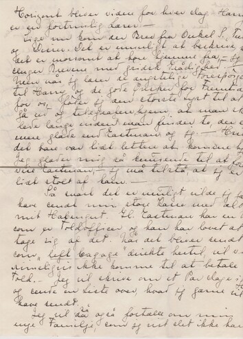 Lige nu kom der Brev fra Onkel S., Tutte og Disser. Det er umuligt at beskrive, hvor det er morsomt at høre hjemme fra, - jeg sluger Brevene med gridsk Grådighed. – Men når jeg læser de ængsteligste Forespørgsler til Harry og de gode Ønsker for Fremtiden for os, føler jeg den største Lyst til at gå ud og telegrafere hjem, at man skal leve længe inden man finder to, der er mere glade end Eastman og jeg. – Hvis det bare var lidt lettere at komme hjem. Jeg glæder mig så knusende til at forevise Eastman, - jeg må tilstå, at jeg er lidt stolt af ham. –