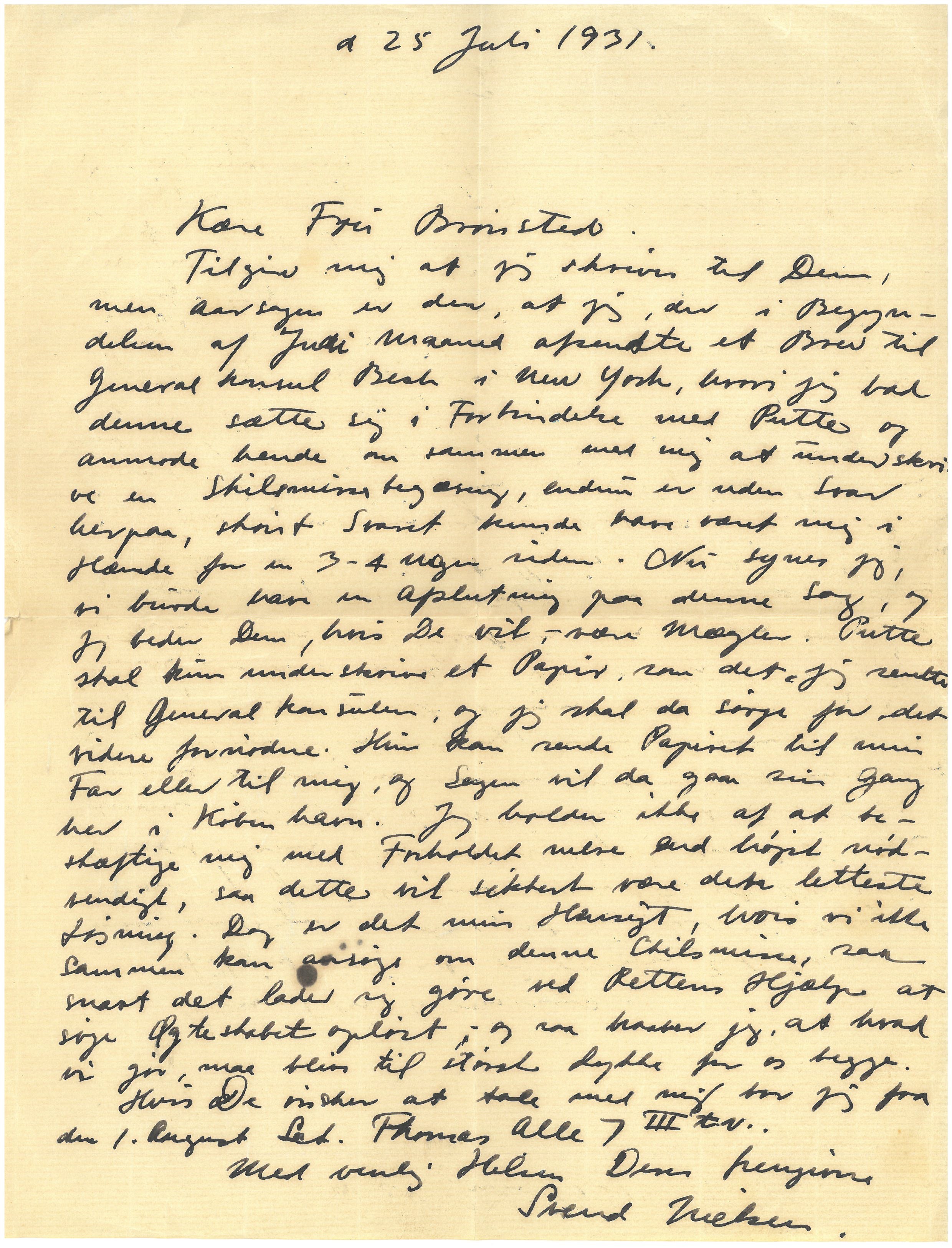Tilgiv mig at jeg skriver til Dem, men Aarsagen er den, at jeg, der i Begyndelsen af Juli Maaned afsendte et Brev til Generalkonsul Bech i New York, hvori jeg bad denne sætte sig i Forbindelse med Putte og anmode hende om sammen med mig at underskrive en Skilsmissebegæring, endnu er uden Svar herpaa, skønt Svaret kunde have været mig i Hænde for en 3-4 uger siden. Nu synes jeg, vi burde have en Afslutning paa denne Sag, og jeg beder Dem, hvis De vil, - være Mægler. Putte skal kun underskrive et Papir, som det, jeg sendte til Generalkonsulen, og jeg skal da sørge for det videre fornødne. Hun kan sende Papiret til min Far eller til mig, og Sagen vil da gaa sin Gang her i København. Jeg holder ikke af at beskæftige mig med Forholdet mere end højst nødvendigt, saa dette vil sikkert være den letteste Løsning. Dog er det min Hensigt, hvis vi ikke sammen kan ansøge om denne Skilsmisse, saa snart det lader sig gøre ved Rettens Hjælp at søge Ægteskabet opløst; og saa haaber jeg, at hvad vi gør, maa blive til størst Lykke for os begge.