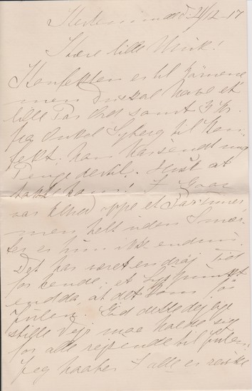 Konfekten er til Børnene, men Du skal have et lille Par Ord samt 3 Kr. fra Onkel Syberg til Konfekt; han har sendt mig Penge dertil. Husk at takke ham! I Gaar var Alhed oppe et Par Timer, men helt uden Smerter er hun ikke endnu. Det har været en drøj Tid for hende; et Lyspunkt endda, at det kom før Julen. Gid dette dejlige stille Vejr maa holde sig for alle rejsende til Julen. Jeg haaber I alle er raske og kan faa en rar Tid. De kærligste Hilsner til Eder alle!