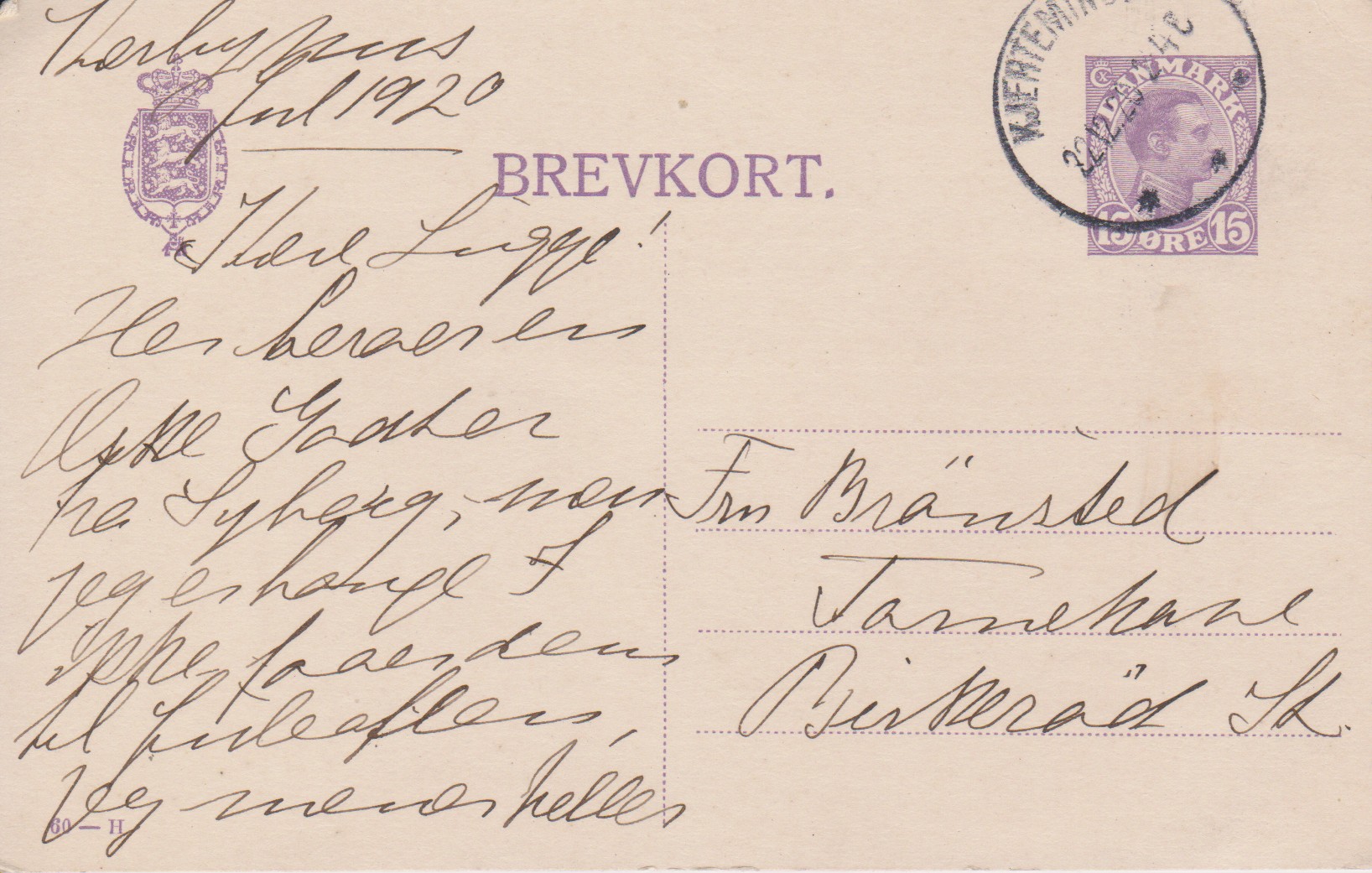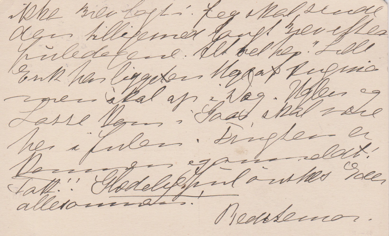 Her leveres en Æske Godter fra Syberg, men jeg er bange I ikke faaer dem til Juleaften, jeg sender heller Brev lagt i. Jeg skal sende dem tilligemed langt Brev efter Juledagene. Alt vel her! Lille Erik har kigget en Uge af Angina men skal op i Dag. Uglen og Lasse kom i Gaar, skal være her i Julen. Frugten er kommen og omdelt! Tak!! Glædelig Jul ønskes Eder allesammen!