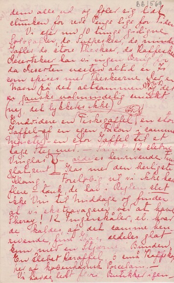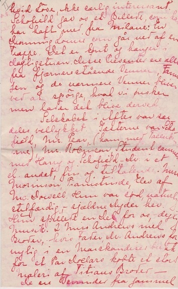 Jeg er meget forbavset over, at mine Breve ikke ere udførlige, (- jeg synes, at jeg er bleven til en sand Skrivemaskine) – men det kommer måske af at jeg har skreven så mange Breve rundt omkring til [”til” indsat over linjen] siden jeg kom her over, og jeg glemmer så efterhånden, hvad jeg har skreven om til hvem.