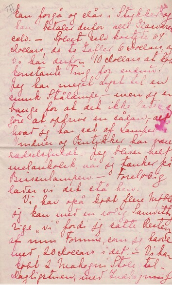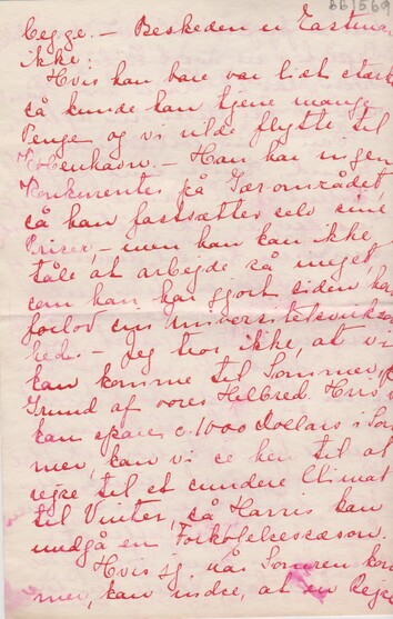 Hvis han bare var lidt stærkere så kunde han tjene mange Penge og vi vilde flytte til København. – Han har ingen Konkurrenter på Gærområdet, så han fastsætter selv sine Priser, - men han kan ikke tåle at arbejde så meget, som han har gjort siden han forlod sin Universitetsvirksomhed. - Jeg tror ikke, at vi kan komme til Sommer, på Grund af vores Helbred. Hvis vi kan spare c. 1000 Dollars i Sommer, kan vi se hen til at rejse til et sundere Climat til Vinter, så Harris kan undgå en Forkølelsessæson.