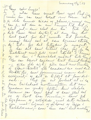 Jeg vilde have sendt Brev med Puf igaar men her var saa koldt om Form. at jeg ikke kunde sidde og skrive, - men nu ser jeg, at der er en Times Tid til jeg skal ud, - den skal du ha! Tak for dit Brev! Hvor dejligt, at du har det helt godt for det meste. Gid Juvelen maa blive ved at være ligesaa strålende! Gid - for det betyder jo meget. Jeg har det saa lutret idag, for jeg har trakteret mig selv med Edikke 3 Timer og vi har i Fællesskab "møvet hele Huset. Her var blevet saadan lidt bundbeskidt - jeg gider ikke rigtig gøre rent om Vinteren og skønt Skidtet ikke saadan ses med det blotte Øje, saa fornemmer man det alligevel, - og det er lifligt at faa det væk. - Puf har vel fortalt at vi var paa Erikshaab Mortensaften. Det var saadan en yndig Aften. Den elskede Pallam var saa sød og saa glad ved os og Vært hver Tomme, - han gik ligefrem og arbejdede med det, - nussede om med Cigarer og Likører og lægge i Kakkelovnen, - saa han var helt anstrængt af det. Men han sagde for Resten, at han havde det godt og ikke havde haft Anfald siden det, Dagen efter at vi havde været der. Men det ved du maaske ikke. Han fortalte os det, da vi var der med Dis og Axel. - Der var noget vist gammeldags over den Tur:, - køre 1 1/2 Time paa aaben Vogn, komme til Gaaren og køre igen i ordentlig Tid. Det kunde svare til en Tur til Søbysøgaard i gl. Dage. ["i gl. Dage" indsat over linjen] Men hvor er der stille paa Erikshaab. Man kan sidde og lytte og ligefrem fornemme Eko'et af de Lattersalver, Herrerne slog op i gl. Dage, - Far og Otto Kn. og Dr. Dis og Præsten og dem allesammen. Nu sidder vi og passer vor Mad og snakker jævnt og stille og forhører om Egnens Folks Sygdomme. -