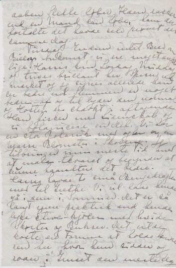 Jeg gaar og er så underlig til Mode fordi vi ingen Telegram har faet fra Billy. Det var en bestemt Aftale at han skulde telegrafere Dagen før Bryllup, så vi kunde vide hvad Dag det er. Men ikke et Muk er kommen endnu. Det er mit Haab at han har glemt det af Sindsbevægelsen, - men alvorlig ængstelig er jeg til jeg hører, om nogen er bleven syg el noget er kommen i Vejen. Sidst fik jeg dit Brev sendt Onsdag Lørdag Aften, - måske jeg får et i Aften [”får et i Aften” indsat over linjen]. Jeg venter Harris om en Time – han kommer for at blive en Uge og jeg venter mig meget af det. Her er så yndigt, - bedårende og vi får udmærket Mad. Det er nogle voldsom rare Mennesker og her er så hyggeligt. Vi ere naturligvis ude den meste Tid, og du kan ikke tænke dig, hvor jeg nyder at kunne male af Hjærtens Lyst uden at behøve at skynde mig ind til Pligter. Man kan dumpe ned hvor det skal være og male, - der er lige smukt alle Vegne. Så snart jeg har malet noget – bærer de det rundt til Naboerne og viser det til dem der kører forbi, - med stor Stolthed og Mrs. Bryan har bestilt Huset malet med Olje, når al denne Røg fra Skovbrandene klarer op. Jeg kan ikke vide om I ser i Aviserne hjemme om alle disse Skovbrande. Der er ikke falden Regn i 2 Maaneder og det er knasende tørt alle vegne. Græsmarkerne [”Græs” indsat over linjen] er brungule, og på åbne Steder i Skovene er Græsset og Bregnerne svedne sort. Når så Toget kører forbi sådanne Steder, kan en Gnist tænde det an – sådan blev den Ild tændt, som jeg skrev om sidst. Op på Form. var der et vældigt Baal, og Mrs B. lod Karlen køre mig over at se det. Det var interessant men ikke noget imod den Skovbrand som vi så den næste Dag: Om Onsdagen var Luften så tæt af Røg, som i den tykkeste Tåge og der blev sagt at hele ”Ragger Mountain” stod i lys Lue. Det var nu Løgn, men der var da Ild på en Snes Steder. Om Eft. kørte vi ud for at opdage det. Det er ikke nemt at finde, fordi Røgen er så tyk ["tyk" overstreget] tæt og Ilden mest ligger og ulmer i Skovbunden. Det var en mageløs Køretur, - halsbrækkende stejle Bakker, - det forekom mig stejlere end ned af Orene, og jeg sad med Livet i Hænderne. Endelig mødte vi nogle Mænd der vidste hvor Ilden var og vi satte Hesten og gik med ham ind mellem Bakkerne, bevokset med Torne og Krat og med store Sten, over Stengærder – o.s.v. til vi kom ned i en Fyrreskov hvor Ilden rasede. Lidt skuffet var jeg, for der var intet stort Baal, - men kun krybende Ild under Skovbunden, - af og til blussede det op og i enkelte Træer brændte det. en 20-30 Mænd sled i det med at smide Sand og Grus på. De fortalte os at over en