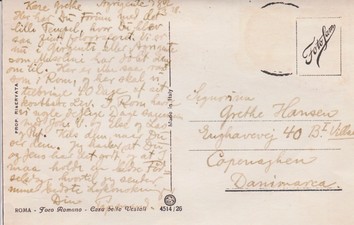 Her har Du Forum med det lille Tempel, hvor Du blev saa fint fotograferet. Vi er nu i Girgenti eller Agrigente som Musolini har døbt den om til. Her er ikke saa rart som i Rom, og her skal vi tilbringe 40 Dage af sit kostbare Liv. I Rom havde vi nogle dejlige Dage sammen med Johs. V. Jensen og Else og Las og Puf. Hils dem, naar Du ser dem. Jeg haaber, at Du og Jens har det godt, og at I maa holde en bedre Fødselsdag, hvortil jeg sender mine bedste Lykønskninger.