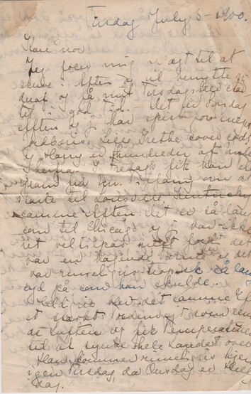 Jeg føler mig oplagt til at skrive i Aften og vil benytte mig deraf og få mit Tirsdagsbrev startet i god Tid. – Det er Søndag Aften og jeg har spist for meget Jordbæris, lille Grethe sover sødt og Harry er Hundreder af Mile herfra – I Fredags fik han Telegram fra Mr. Tiffany om at starte til Louisville, Kentucky samme Aften. Det er så langt som til Chicago, og jeg var jo ikke ret veltilpas, mest fordi det var en bagende Varme her [”her” indsat over linjen] og det var rimeligvis tropisk så langt syd på, som han skulde. Heldigvis blev det samme Eft. et stærkt Tordenvejr som rensede Luften og fik Temperaturen til at synke hele Landet over.Han kommer rimeligvis hjem igen Tirsdag, da Onsdag er Helligdag.