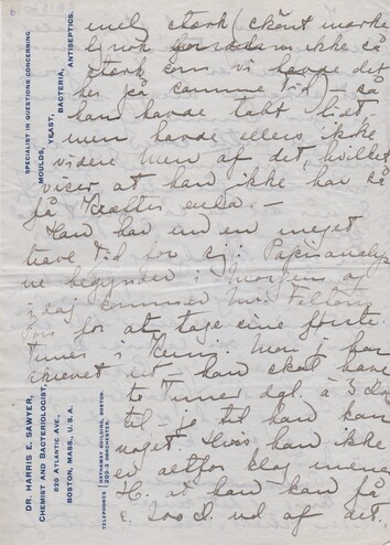 Endelig idag kan man da ånde, og jeg benytter Lejligheden til at begynde et, som jeg håber, langt Brev. Iaftes da vi gik i Seng, var det brændende varmt - men pludselig gav det sig til at blæse stærkt med en Østenvind og i Løbet af 10 Min. var det næsten koldt. Disse pludselige Vejrforandringer er noget [”noget” overstreget] karakteristisk for Boston og Omegn.