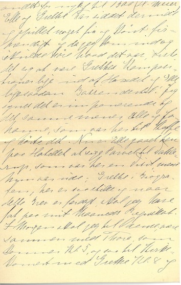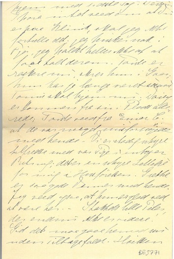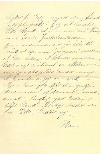 Vi blev meget glade ved Dit sidste Brevkort i Tirsdags; jeg var begyndt at blive en Smule urolig, men saa ringede Alhed og Christine Mandag Aften og fik at vide, det gik godt med Dig. Nu haaber jeg Du faaer denne lille Sending "Bagateller" Søndag Morgen. Vi har som sædvanlig ingen Nyheder at fortælle; det skulde da være, Du endnu ikke har hørt det gode Kup Las har gjort nemlig at Magnussen har købt Malerier for 15000, saa han slipper for at lave Udstillingen, hvad han egentlig nødig vilde saa kort efter den forrige store og efter Kunstforeningens! Og der blev heldigvis en hel Del tilbage, som kan være Grundlag for en Udstilling ad Aare. Af Båxhult Billederne blev de bedste tilbage. Alhed selv solgte for 300. Magnussen var der 4 Dage; det er en elskværdig Mand; de var her med ham til en 5 The, og han saae hele Huset. - I Brædstrup staaer alt saare godt til, veed jeg dels pr. Brev og dels pr. Telefon. Minna nyder i fulde Drag sin Barselseng; bliver overlæsset med Gaver af alle Slags; Ørenringe med Diamanter til 500!! ["til 500!!" indsat over linjen] af sin Broder Frits; en Bankbog med 100 Kr. af Dede samt en magelig Lænestol. De har faaet ny Pige til Nobr; Line sagde op, da det viste sig at der skulde komme en Baby igen!! men den nye er "en Engel", siger Dede, og nu har de ogsaa Barnepige, saa de kan nok klare sig, mener han! - Sygeplejersken er uhyre rar og flink. Paa Fredag skal Minna op. Drengen "siger aldrig et Muk"! - Jeg citerer stadig Dede! Han venter "en meget stor Termin" - men paa en lidt anden Facon end vi andre Stakler! Hans giver dem en god Indtægt? Tænk han vil komme her et Par Dage i Julen! det glæder vi os alle meget til; enten efter Julen eller Nytaar. De venter hele Familien fra Kbh der nogle Dage; jeg antager, de skal have Barnedaab og at Fru Kattrup skal bære. - Paa Mandag skal vi alle til Middag paa Risinge og jeg havde den Sorg i Gaar, at de tør ikke have Agrarens med for Mæslingerne; Johanne var saa grulig skuffet; havde lige en Timestid at glæde sig og fik gjort Aftale med Alhed om at laane Kjole hos hende! Men saa gav det sig, at Peter havde fraraadet Kattrups dem! Saa sjelden de bliver bedt til noget og at Johanne glædede sig dertil. Berthelsens skulde der og Bichels. - Nu er lille Conrad ogsaa syg, men endnu ret mildt; Bibbe oppe, Grethe endnu ikke smittet. - Vi har haft en festlig Dag med Elle hjemme. Hun har været et Par Smaature ude at male to Akvareller og derved tjent ca. til Julegaver. Der er bleven spurgt hos Madsen efter Billeder af hende, saa hun vil hænge i det hun kan inden Jul. Hun har nylig igen faaet Procenter af et Klaver; det 6_te_ i Aar!! - det ene et Flygel, et andet for nylig til 1300 (H. Meier.) Elle og Grethe har siddet derinde og spillet noget fin og kønt firhændigt og da jeg kom ind og skulde høre hvad det var, viste det sig at være Grethes Kompositioner lige ud af Hovedet og Elle ligesaadan Bassen dertil ! Jeg synes det er imponerende og det samme mener Elle og Johanne, som var her til Kaffe og hørte det. Nu er Eller gaaet hen paa Hotellet til Dahlerup, som var her en Visit, mens hun var ude; Grethe i Biografen, her er saa stille og naar dette Brev er færdigt, skal jeg have fat paa mit Maaneds Regnskab. I Morgen skal jeg til Odense, være sammen med Thora, som kommer Kl. 5, og saa til Kirkekoncert med Grethe Kl. 8 og hjem med sidste Tog. Dersom Thora intet veed om at Du er paa Klinik, skal jeg ikke fortælle det; jeg husker nok i Fjor, jeg holdt heller ikke af at faae talt derom. Tante er raskere nu, skrev hun i Gaar; hun har jo længe været snavs. Tonni skal hjem nu; Daisy er kommen fra sin Plads allerede; Tante veed fra Einar C. at de var meget misfornøjede med hende. Vi er stadig uhyre tilfredse med vor Pige i enhver Retning; det er en uhyre Lettelse for mig i Husførelsen. Grethe er saa gode Venner med hende. Jeg veed ogsaa, at hun er glad ved at være her. - Stakkels lille Peter, der endnu ikke er videre! Gid det maa gaae fremad nu uden Tilbagefald. Hvilken Lykke for Eder med den flinke Sygeplejerske! Jeg vil haabe lille Muk at Du nu vil kunne taale Juletravlheden! den nærmer sig jo stærkt. Tænk at der nu er gaaet næsten et Aar, siden I havde mig som halvvejes Patient og allesammen var saa mageløse mod mig! I Vinter er jeg saa rask. - Nu troer jeg ikke Du gider høre mere af denne Smaasnak! Rigtig god Bedring lille Muk! Kærlige Hilsener fra Elle, Grethe og