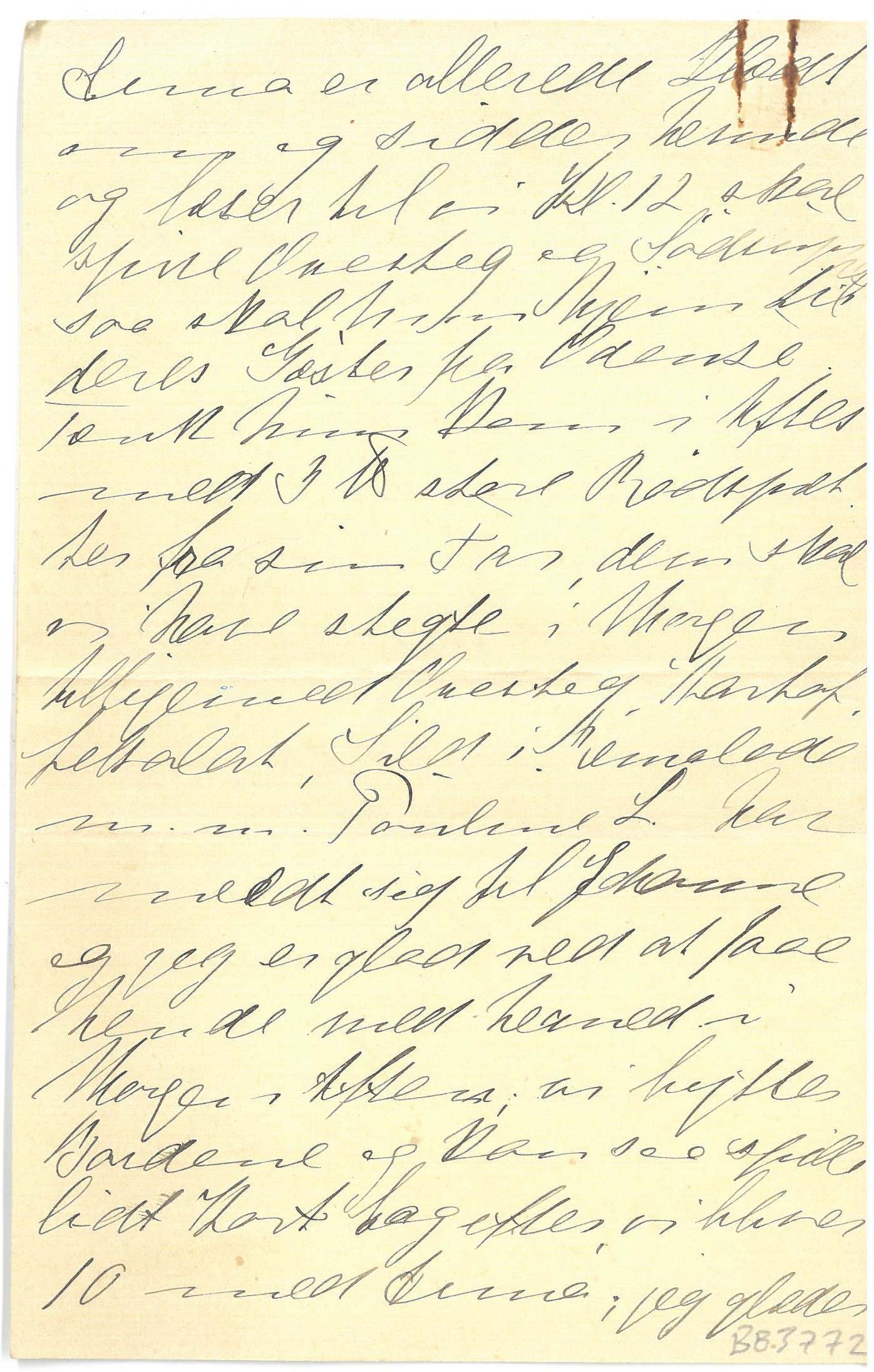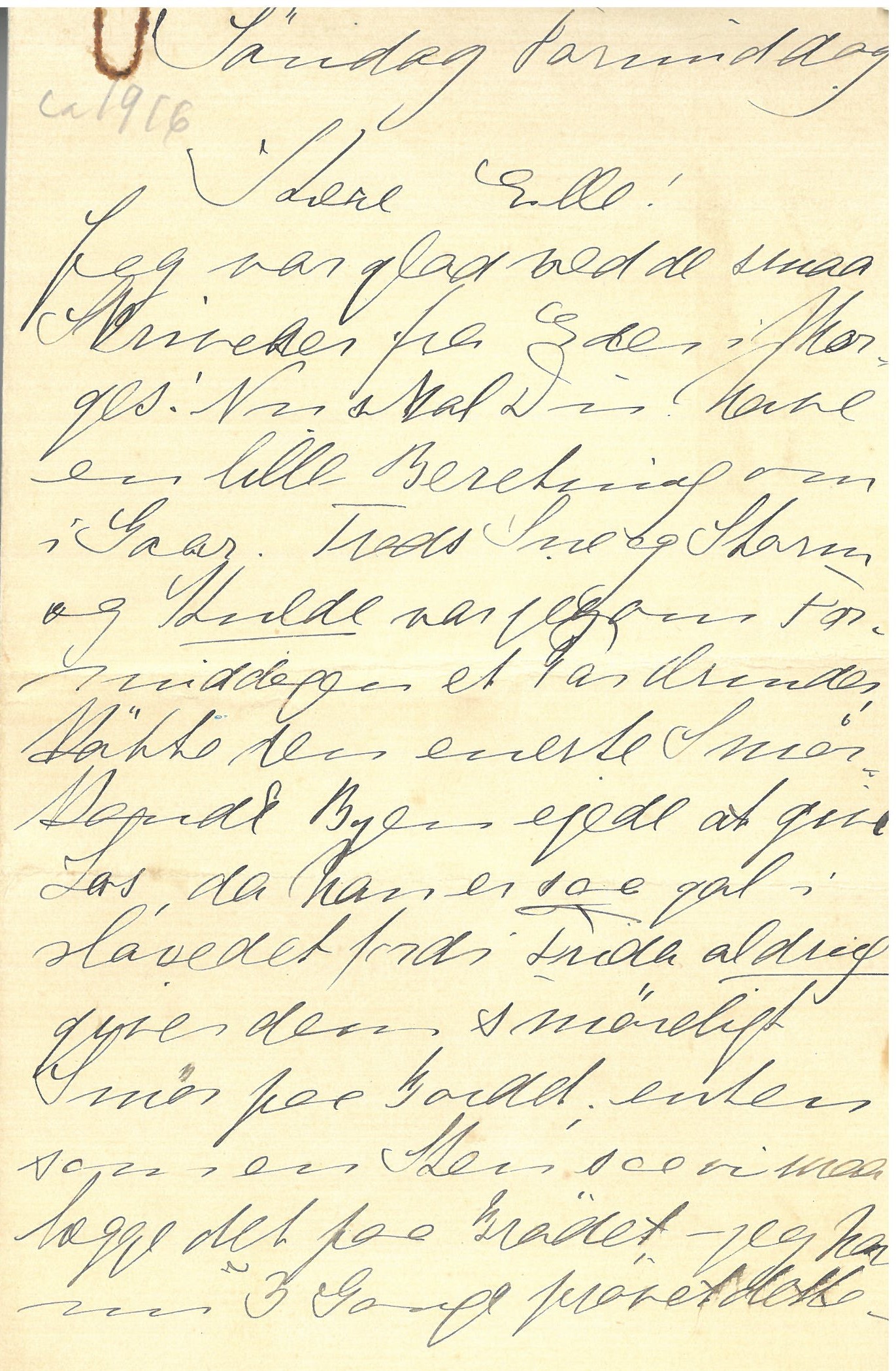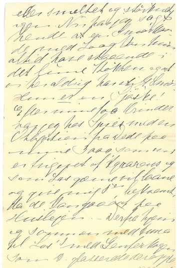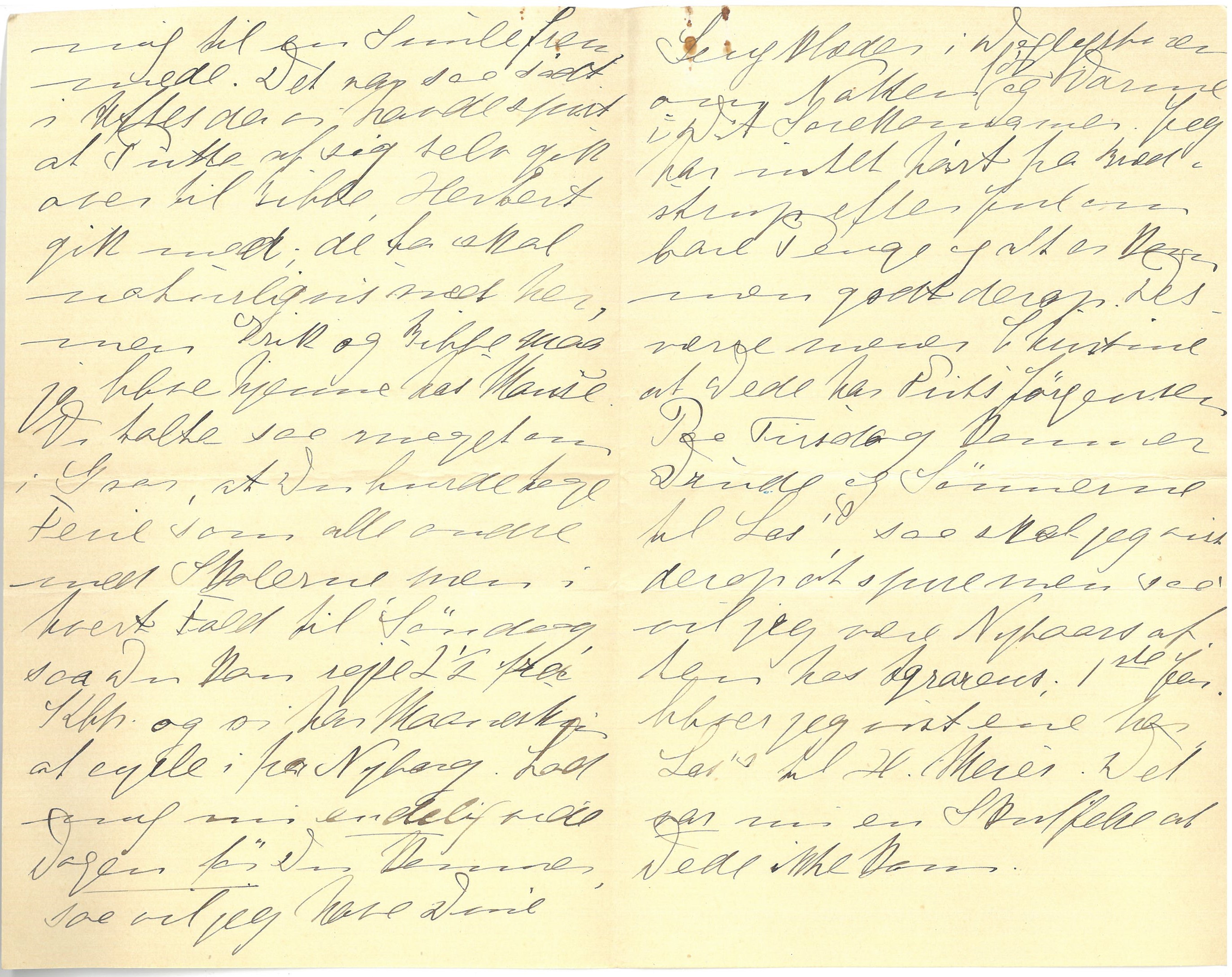 Jeg var glad ved de smaa Skrivelser fra Eder i Morges! Nu skal Du have en lille Beretning om i Gaar. Trods Sne og Storm og Kulde var jeg om Formiddagen et Par Ærinder, købte den eneste Smør-Kande Byen ejede at give Las, da han er saa gal i Hovedet fordi Frida aldrig giver dem smøreligt Smår paa Bordet; enten som en Sten saa vi maa lægge det paa Brødet, - jeg har nu 3 Gange prøvet dette - eller smeltet og størknet igen. Nu har jeg sagt hende at en Smørkande med Laag kan hun altid have staaende i det lune Køkken og at vi her aldrig har skilt Smør. Hun er en Sjuske! Efter mine faa Ærinder var jeg hos Spies med en Obligation fra Dede paa mine 3000, som nu er frigivet af Agrarens og som Las gærne vil laane og give mig 5 % bekomst, da de kan gaae af paa Huslejen. - Derfra hjem og sammen med Anna til Las's med Genferkagen som A. glasserede deroppe, men hun gør det ikke saa godt som Grethe den var for lind og flad. Vi fik en solid Frokost, de har hele Julen spist af en vældig Skinkesteg vist en 30 Pund!! udmærket; Gaasefedt og d_o_ Leverpostej, storartet. Rasmus Petersen og Agrarens var der. Frida var kommen syg hjemmefra med første Tog saa efter Frokost fik vi hende op at sove, Alhed og hjalp i Køkkenet, jeg pillede den vældige Kasse Rosenkaal, vi vadskede lidt af, Valborg udgød stride Taarer over Gud veed hvad og da hun saa langsom var færdig med sit til Spisning 6 1/2, tog A og jeg Kaffeopvadsken, det værste Valb. veed er jo at blive hjulpen, Frida mødte ca. 6 ret vel, dejlig kogt Grød og d_o_ Oksebryst - Genferkagen god; hvid Vin og A[ulæseligt] til. Gammel Mand kom ved 4 1/2 Tiden og Alhed overtalte ham i den Grad til at blive, hvad næsten var Synd for den 78 gange Mand at skulde hjem med 11.Tog og gaae til Bøgebjerg. Trods Manses Sygdom var Junge med om Aftenen og lille Bibbe var alene hjemme med M. som var vaagen hele Aftenen og legede i sin Seng i Dagligstuen, Grethe bedt ud og Ingrid desværre hjemme og syg endnu i Dag, svære Juledage for Johanne, men Marie overgaaer ["overgaaer" overstreget] overgaaer sig selv og hjælper; Agraren ogsaa. Marie fulgte mig hjem i Aftes og Anna havde jeg bedt om at være her Kl. 10 og have Dunk i min Seng. Det var en yndig hyggelig Dag for mig deroppe. Jeg er helt glad ved nu igen ligesom 2_den_ Juledag at være ene hele Dagen. Anna er allerede klædt om og sidder herinde og læser til vi Kl. 12 skal spise Oxesteg og Sødsuppe saa skal hun hjem til deres Gæster fra Odense. Tænk hun kom i Aftes med 3 Pund store Rødspætter fra sin Far, dem skal vi have stegte i Morgen tilligemed Oxesteg, Kartoffelsalat, Sild i Remolade m.m. Pouline L. har meldt sig til Johanne og jeg er glad ved at faae hende med herned i Morgen Aften; vi bytter Bordene og kan saa spille lidt Kort bagefter, vi bliver 10 med Anna; jeg glæder mig til en Smule fremmede. Det var saa sødt i Aftes da vi havde spist at Putte af sig selv gik over til Bibbe, Herbert gik med; de to skal naturligvis med her, men Erik og Bibbe maa jo blive hjemme hos Manse. Vi talte saa meget om i Gaar, at Du burde tage Ferie som alle andre med Skolerne men i hvert Fald til Søndag, saa Du kan rejse 2 1/2 fra Kbh. og vi har Maaneskin at cycle i fra Nyborg. Lad mig nu endelig vide Dagen før Du kommer, saa vil jeg have Dine Sengeklæder i Dagligstuen om Natten før ["før" indsat over linjen] og Varme i Dit Sovekammer. Jeg har intet hørt fra Brædstrup efter Julen bare Penge og alt er kommen godt derop. Desværre mener Christine at Dede har Frits Jørgensen Paa Tirsdag kommer Drude og Sønnerne til Las's, saa skal jeg vist derop at spise men saa vil jeg være Nytaarsaften hos Agrarens; 1_ste_ Jan. bliver jeg vist ene hos Las's til H. Meier. Det var en Skuffelse at Dede ikke kom. [Resten af brevet mangler]