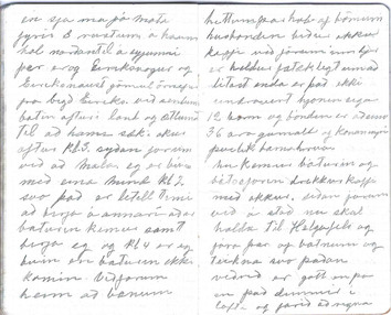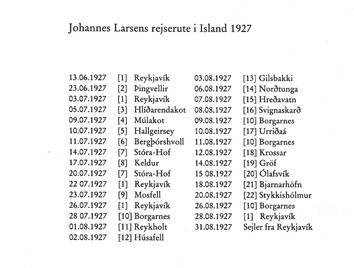 - Góðan dagin vinir mínir í dag ætlum við á Breiðafjarðareyjar eg fer út strags kl 8 til að útvega bát við faum agætan mótorbat huggulegan og ganggóðann við förum um borð vertinn filgir okkur niður á briggju og nú af stað sjóferðin geingur vel við forum framhjá mörgum eyjum þar er fólk í óðaönn að heyja það er ágætt veður í dag bjart og heiðskírt en kalt. Við erum tæpan klukkutima á ferð þar til við komum að Öxney þar sem Eiríkur Rauði bjó áður hann fór til Grænlands hjer förum við í land og fáum dreing hjer á bænum til að vísa oss leið að rústum Eiríksbæjar þær eru nú varla leingur greinilegar en sjá má þó mota fyrir 8 rustum á haum hol norðantil á eyjunni þar er og Eiríksvogur og Eiríksnaust gömul örnefni frá bigð Eiríks. við sendum bátin aftur í land og ætlumst til að hann sæki okkur aftur kl 3 syðan förum við að mála. eg er búin með eina mind kl 2 svo það er lítill tími að birja á annari áður baturinn kemur samt birja eg og kl 4 er ég búin og en báturinn ekki komin. Við förum heim að bænum hittum þar hop af börnum husbondin biður okkur kaffi við förum inn hjer er heldur fátæklegt um að litast enda er það ekki undravert hjónin eiga 12 born og bóndin er aðeins 36 ára gamall og konan ingri þvílík barnahrúga. nú kemur báturin og bátsstjórin drekkur kaffi með okkur. síðan förum við á stað nú skal halda til Helgafels og fara þar af bátnum og teikna svo þaðan veðrið er gott enþá en það dimmir þar í lofti og fer að rigna til fjalla þegar við erum komnir hálfa leið þá bretum við á ætlun og förum beint til St.hólms en það stendur heima þegar við erum nýkomnir hjer inn þá birjar að rigna. hjer er ágætt að vera eitt með bestu hótelum sem við höfum haft og sama seigir Larsen hann seigir það besta hótel á Íslandi við faum agætan mat og erum líka ornir matlistugir því við höfum ekki borðað síðan kl 10 í morgun. Eftir matin förum við út til að hitta danska menn sem hjer eru og Larsen þekkir við erum stutt hjá þeim en förum heim og Larsen fer að hátta en þegar hann er nýháttaður kemur Ágúst Þórarinsson að sækja okkur en Larsen nennir ekki að fara á fætur svo ég fer einn eg er þar til kl 12 og skemti mjer vel þá fer ég heim að hátta og sofa. Góða nótt elskan mín.