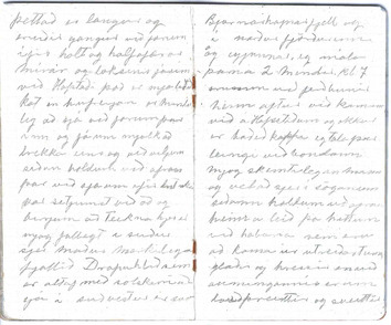 - Góðan dagin litla vina við forum snemma á fætur því nú ætlum við í langan gaungutúr við ætlum ifir á elst þingstað landsins nt. að Hofstöðum á Þorsnesi það er 2 tíma gangur hvora leið eg birja nu dagin á því að reyna að hringja heim. eg bíð við síman í 2 tíma og ekkert gengur svo ég verð að fara en á morgun reini ég aftur jæja nú höldum við á stað, hjer eru allir að fara í utreiðartúr það er sunnudagur elsku vinir gaman væri að þið væruð hjer í dag þetta er langur og erviður gangur við förum ifir holt og hálfófærar mírar og loksins sjáum við Hofstaði það er mjög lítið kot en húsfreijan er myndarleg að sjá við förum þar inn og fáum mjolk að drekka eins og við viljum síðan höldum við afram þar til við sjáum ifir dritsker þar setjumst við að og birjum að teikna hjer er mjög fallegt í suður sjer maður merkilega fjallið Drapuhlíð sem er alltaf með sólskininu í suðvestur er svo Bjarnarhafnarfjall og í norður fjörðurinn og eyjarnar eg mála þarna 2 mindir kl 7 erum við ferðbúnir heim aftur við komum við á Hofstöðum og okkur er boðið kaffi og ég tala þar leingi við bondan mjög skemmtilegan mann og vel að sjer í sögunum síðan höldum við áfram heim á leið þá hittum við knabana sem eru að koma úr utreiðatúrnum glaðir og hressir en við aumingjarnir erum dauðþreyttir og sveittir en loks komum við heim kl 10 þá borðum við og förum svo að hátta. Góða nótt hjartans mamma mín og Lára og litli Reinir og pabbi og allir ég kissi ykkur öll í andanum.